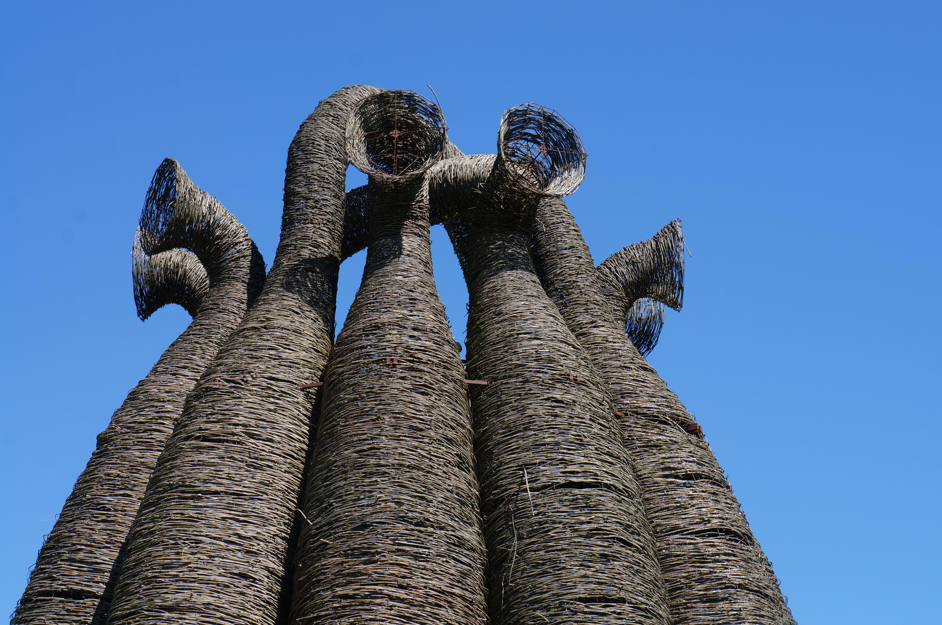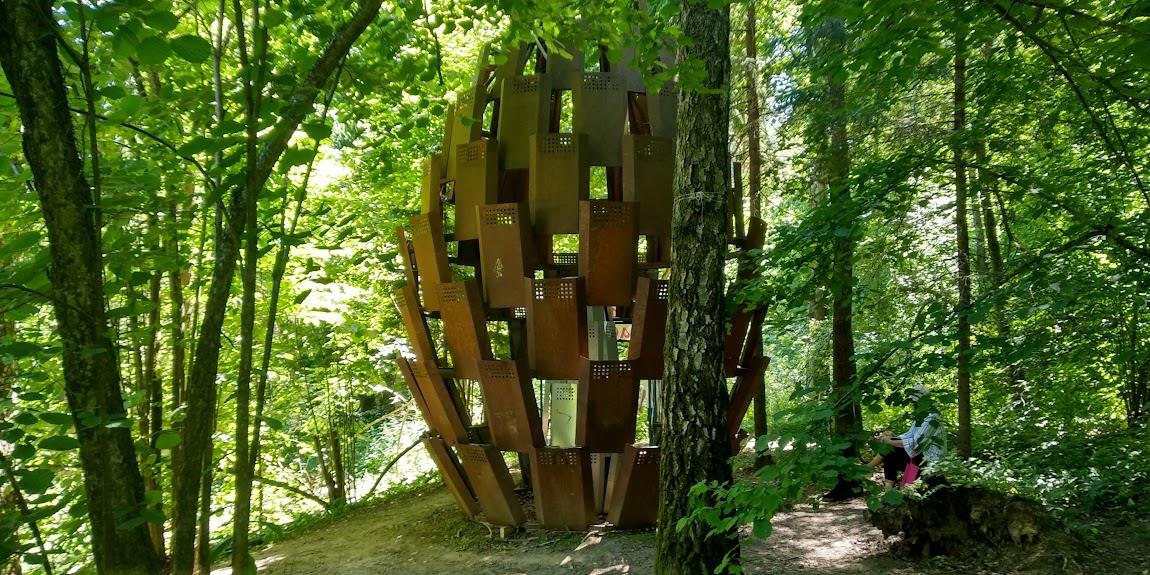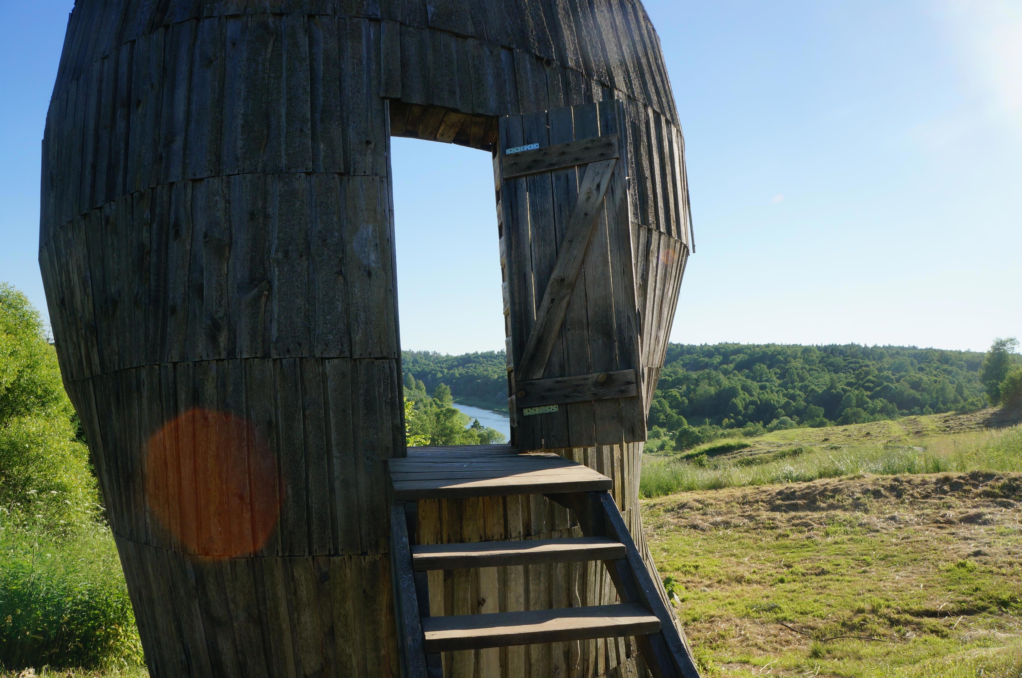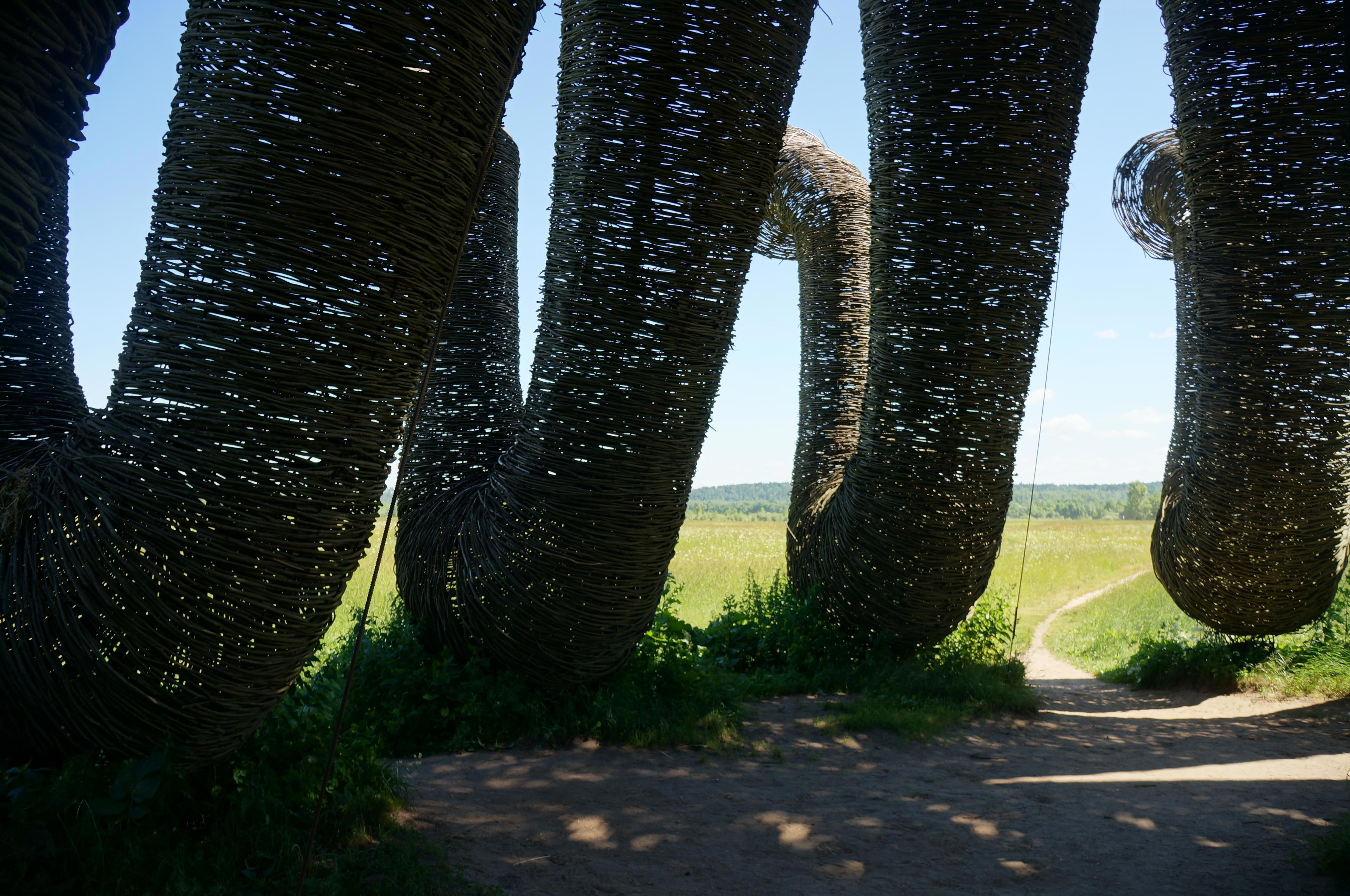 Бобур это одновременно и отсылка к пушкинской голове в поле, и парижскому музею Помпиду (он же Бобур), фасад которого украшают открытые вентилляционные трубы. Наверху: смотровая площадка, и если с Парижского Бобура видно весь город, то отсюда весь Никола-Ленивец. Как и со всеми объектами Никола Полисского, местные материалы и техники, отсылающие к традиционным деревенским ремеслам и забавам, заставляют его скульптуры в ландшафте казаться естественным природным явлением вроде птичьих гнезд или бобровых плотин.