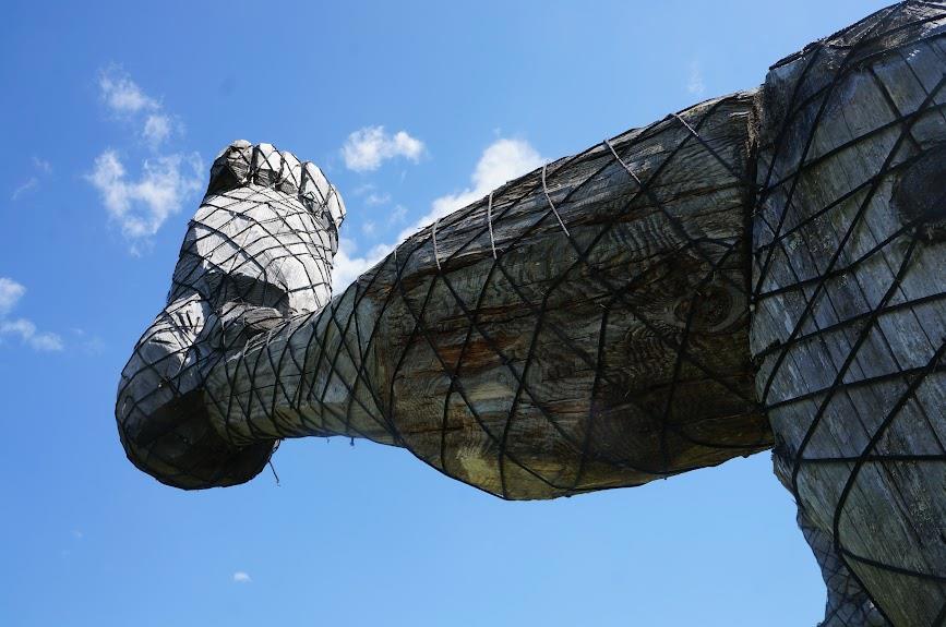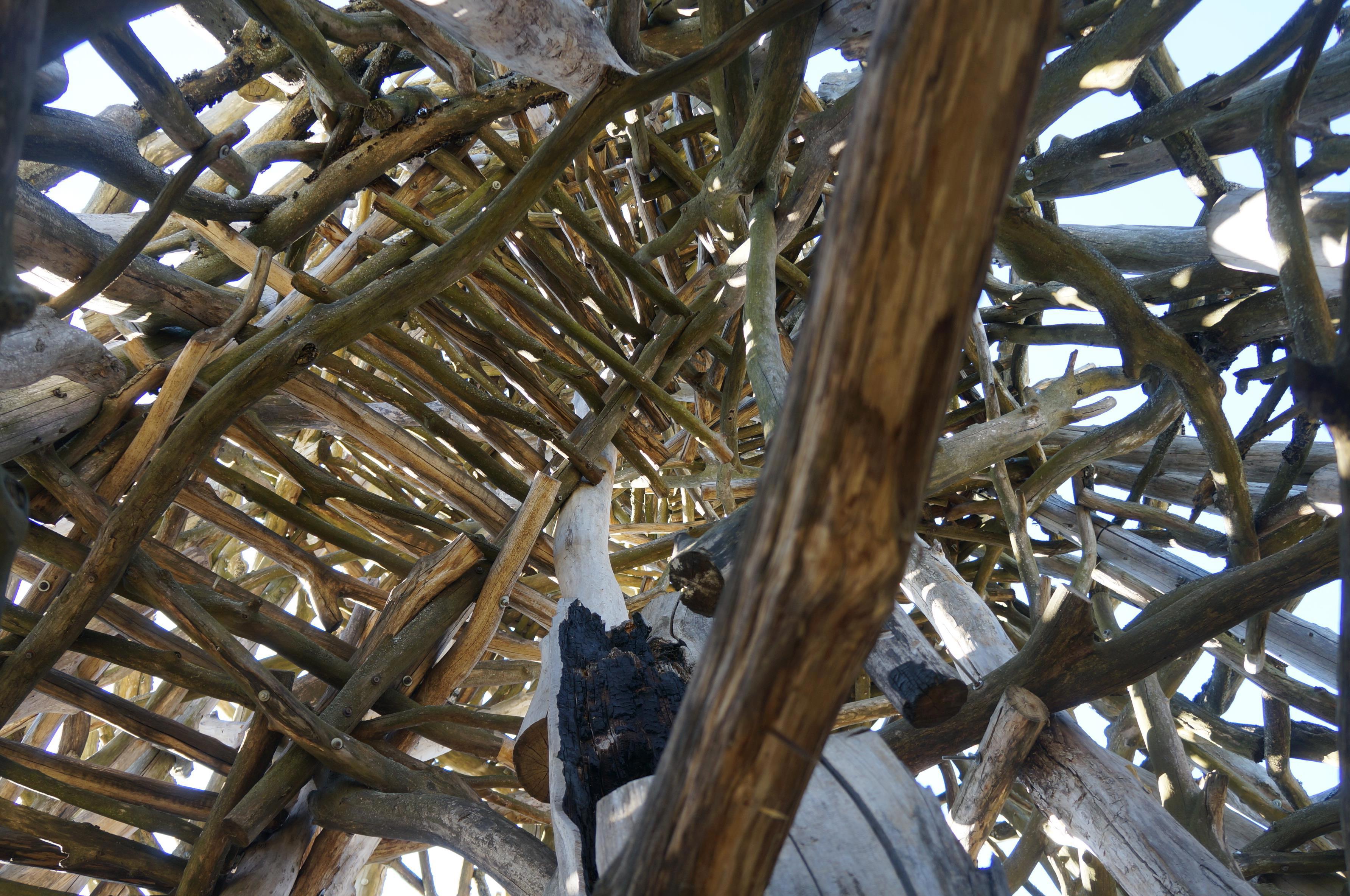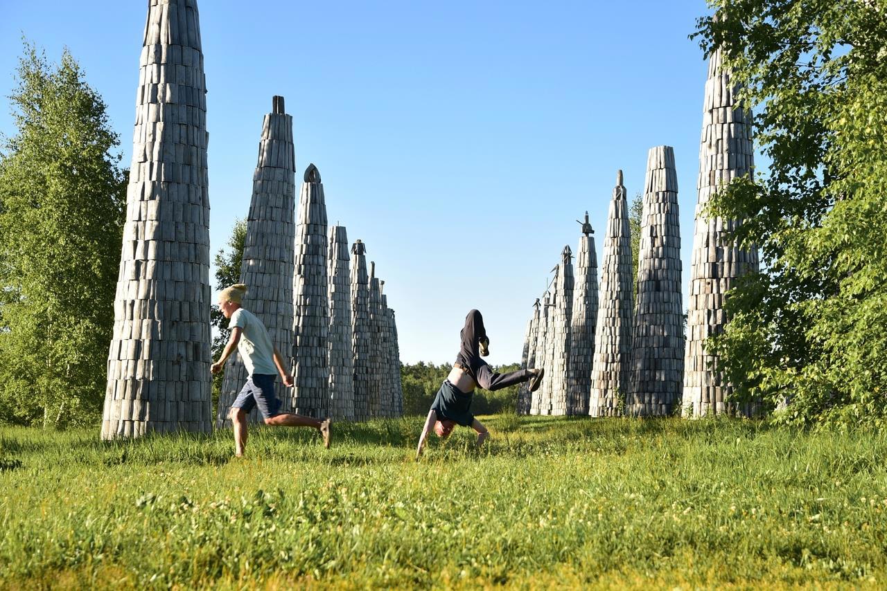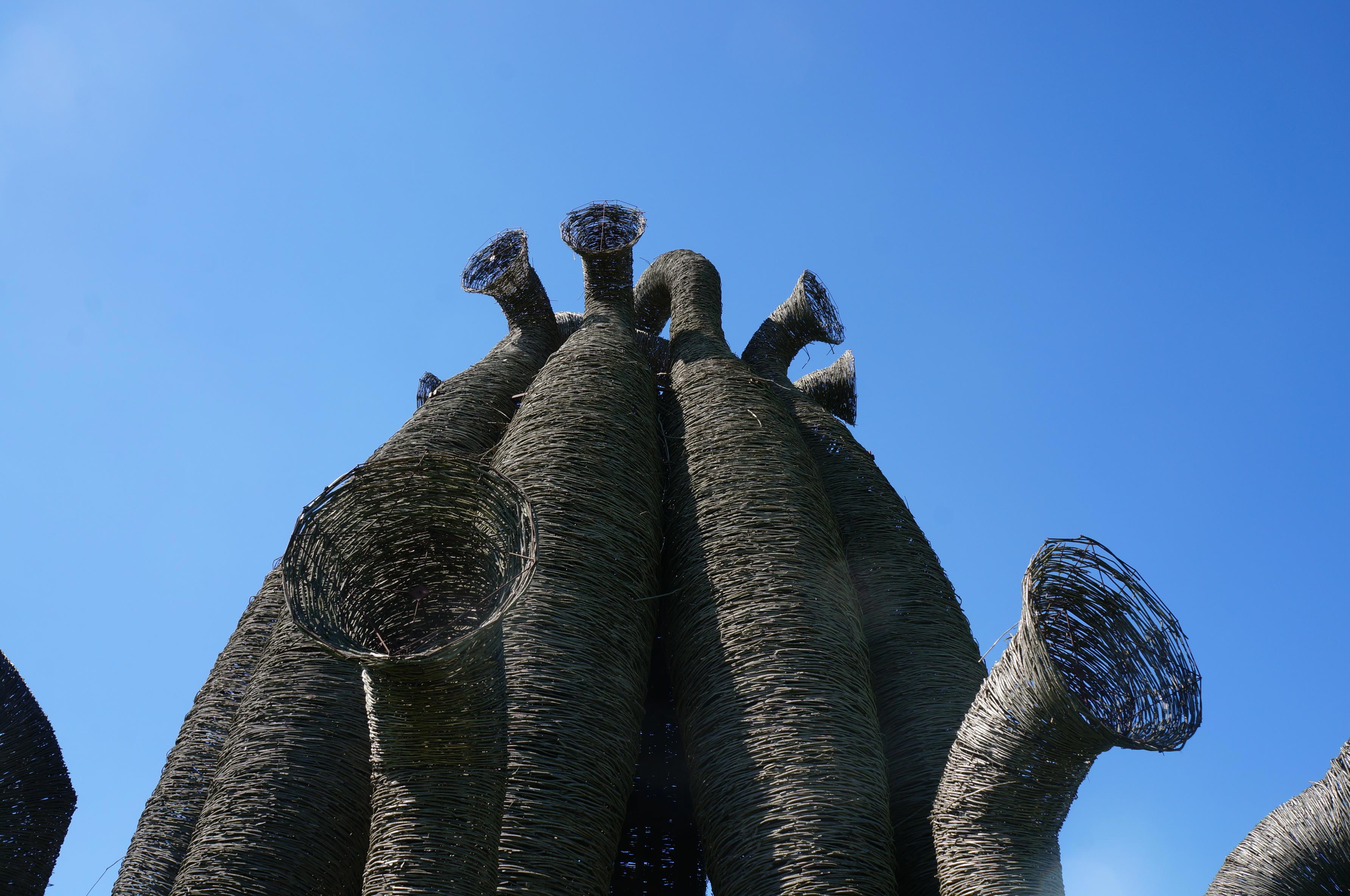 Бобур это одновременно и отсылка к пушкинской голове в поле, и парижскому музею Помпиду (он же Бобур), фасад которого украшают открытые вентилляционные трубы. Наверху: смотровая площадка, и если с Парижского Бобура видно весь город, то отсюда весь Никола-Ленивец. Как и со всеми объектами Никола Полисского, местные материалы и техники, отсылающие к традиционным деревенским ремеслам и забавам, заставляют его скульптуры в ландшафте казаться естественным природным явлением вроде птичьих гнезд или бобровых плотин.