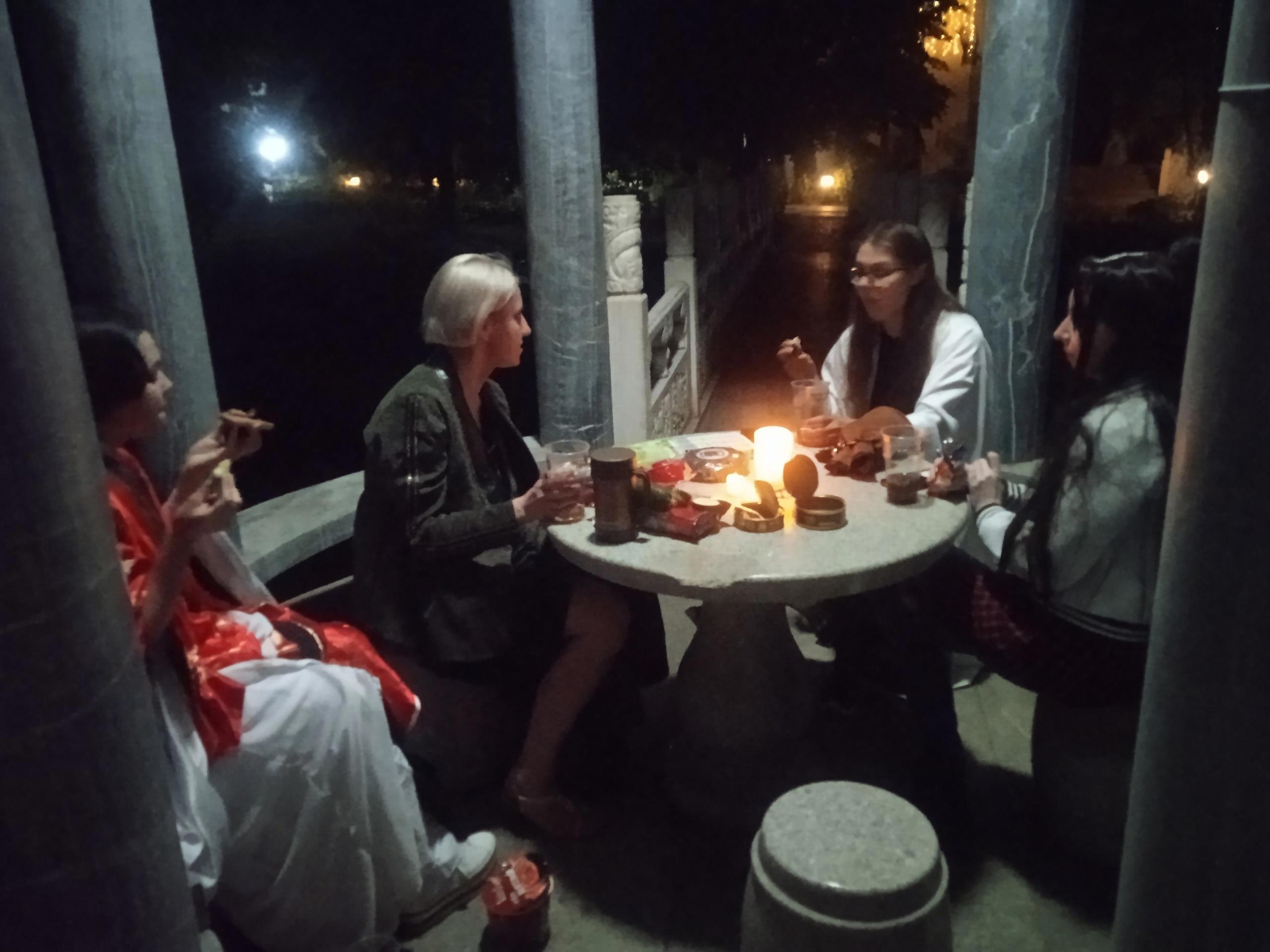 А! С Генералами Се Ляня было два смешных момента. Когда мы шли на выход, у храма снимались Се Лянь и Хуа Чэн, они нам помахали и мы им. Потом у нашего корпуса увидели других хуаляней, устроили им сцену "Ваше высочество, отойдите от него! Ты что с ним спал?! А ты вообще отойди, ты тип подозрительный!" Потом пришли на завтрак и рассказывали радостно сидящим с нами за столом про то что встретили две пары.
