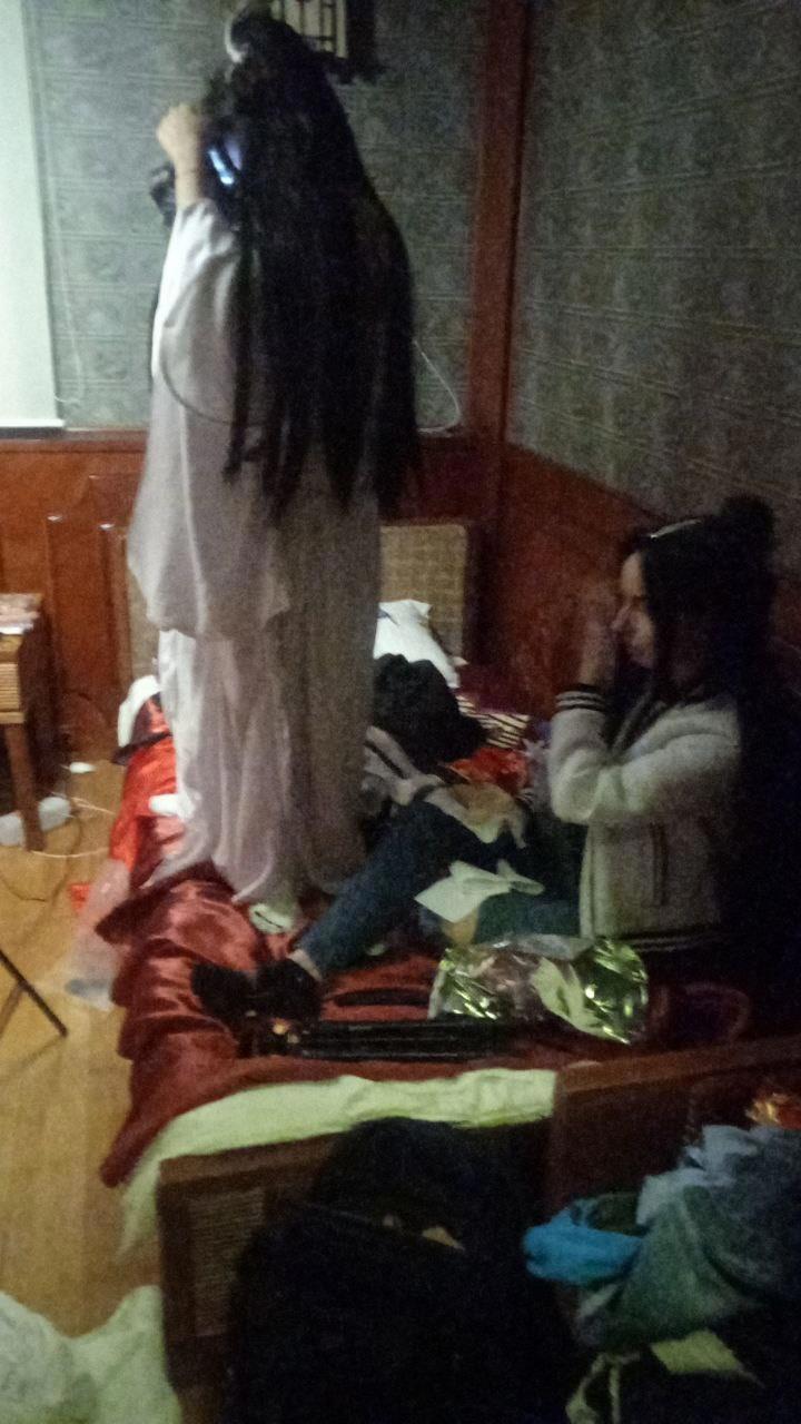 Выезжали в 15 на трансфере, и в 14.30 в туалете комплекса наткнулись на Чу Ваньнина, который смывал с лица кровь (театральную). То есть эрху снимали прям до упора, и как они успели переодеться потом, при том что в номера уже нельзя было - загадка, но успели.
