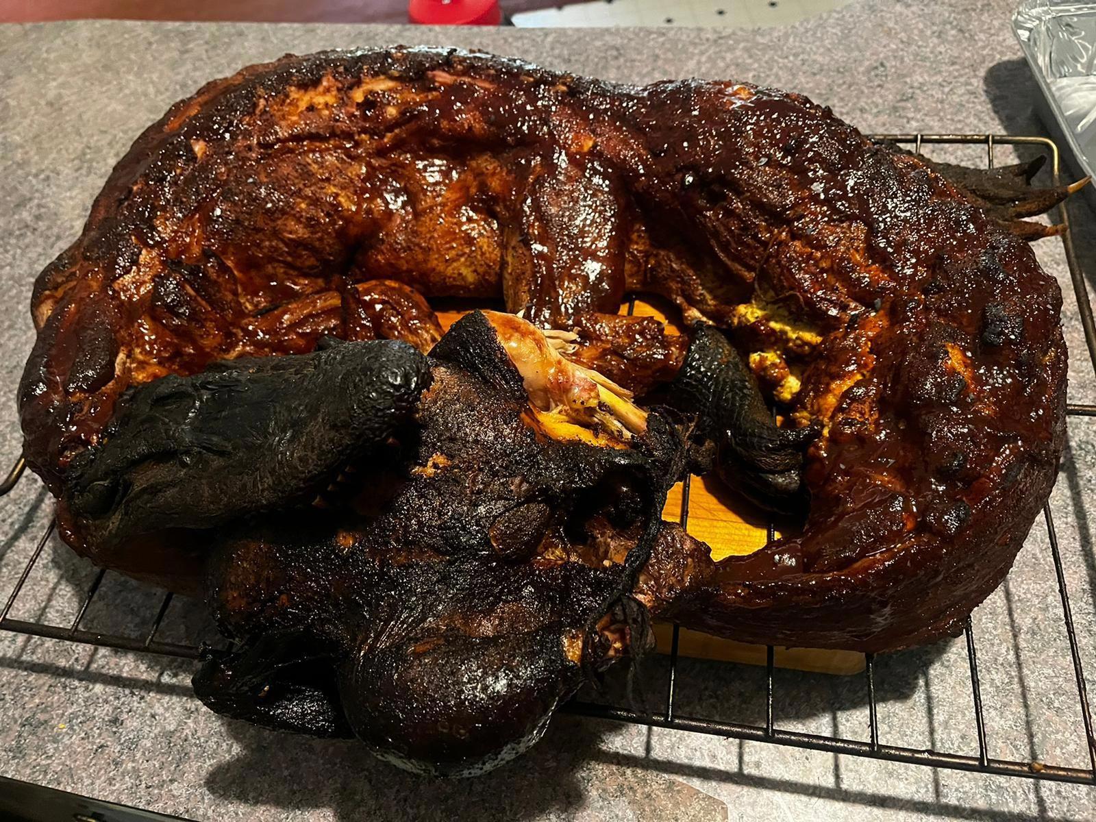 Автор: Нина ДемидоваПривет, ребята. Думаю, удивить молочным поросенком нас будет сложно - иной раз на какое-нить торжество вполне годный деликатес. А гляньте, что привычнее в местах, где живет моя дочь. Тоже "молочный", только не поросенок, а... крокодил, вернее, целых два ))) Вот уж правда, каждый по-своему отмечает праздник! На заднем плане хорошо видна крокодилья лапа с когтями.