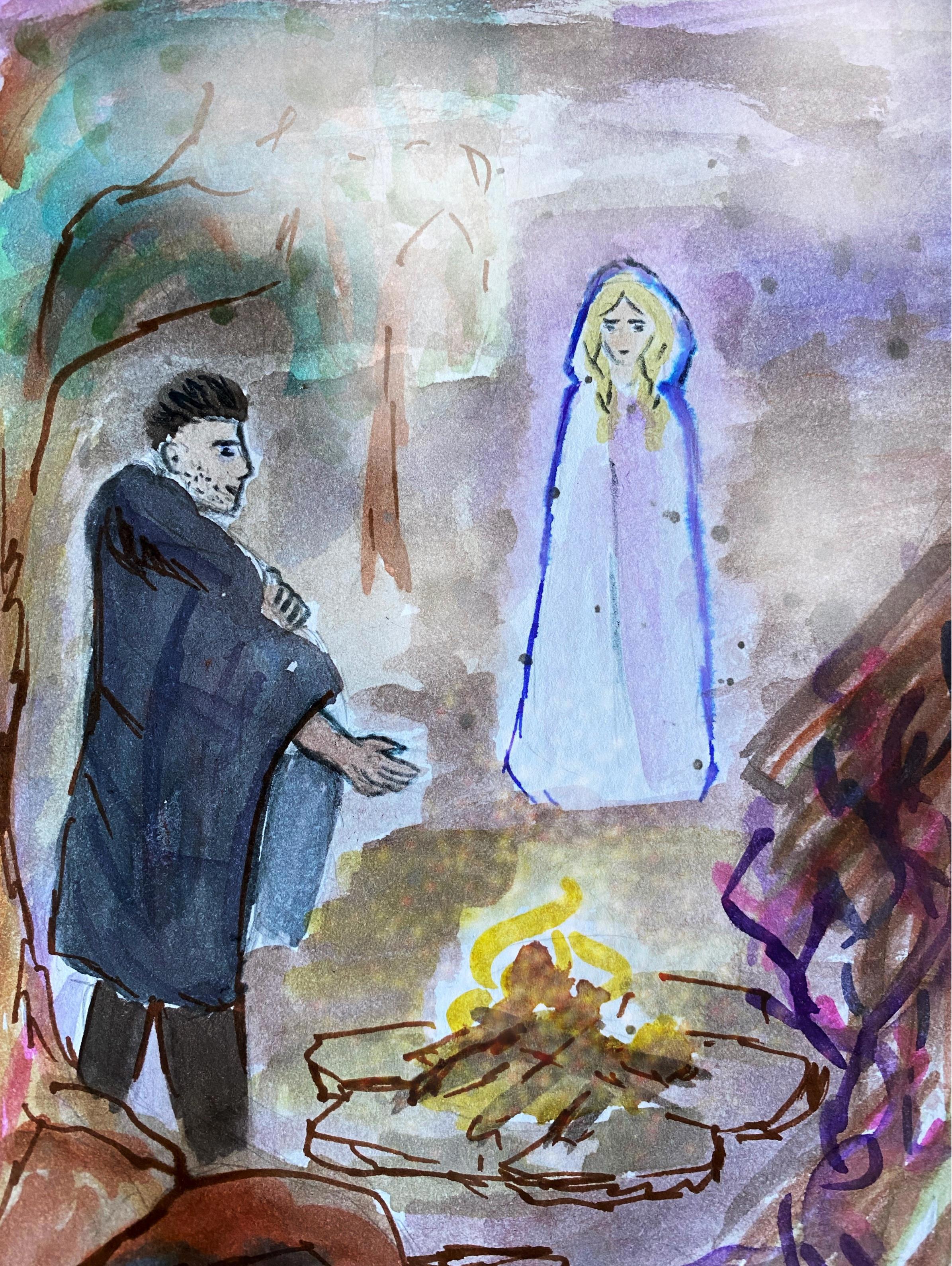 Впрочем, это тот случай, когда герои вели себя крайне самостоятельно. Йоли сама показала мне эту дорогу и отправилась по ней не в солнечный погожий денёк, как представлялось мне изначально, а вечернюю туманную морось. Она же выбрала первую фразу для диалога, на которую оказался нанизан вообще весь сюжет первой смысловой части.