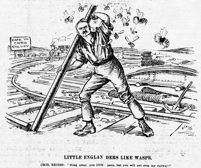 J. M. Staniforth. Противники Родса, изображённые в виде ос, пытаются помешать ему завершить строительство трансконтинентальной железной дороги