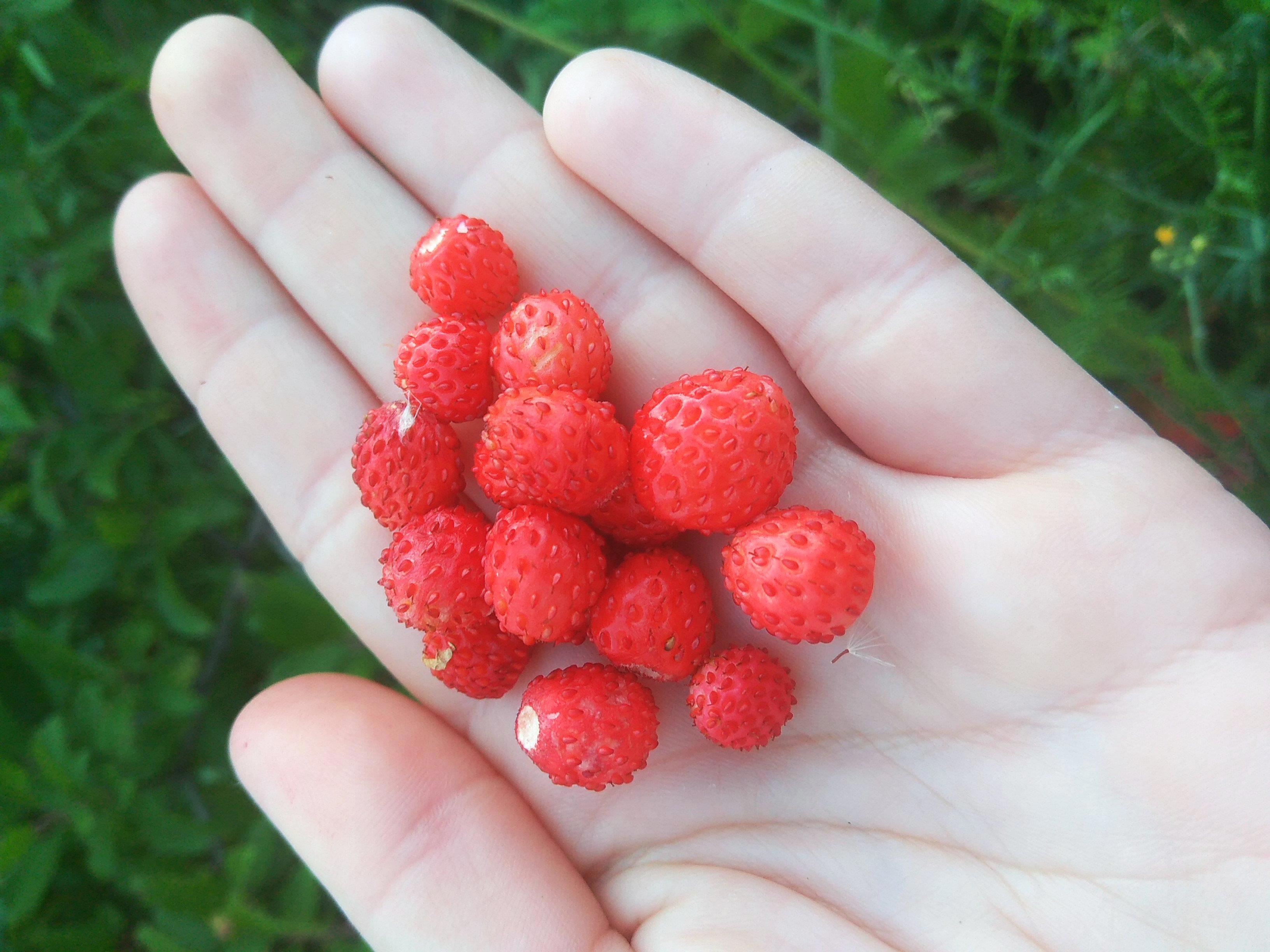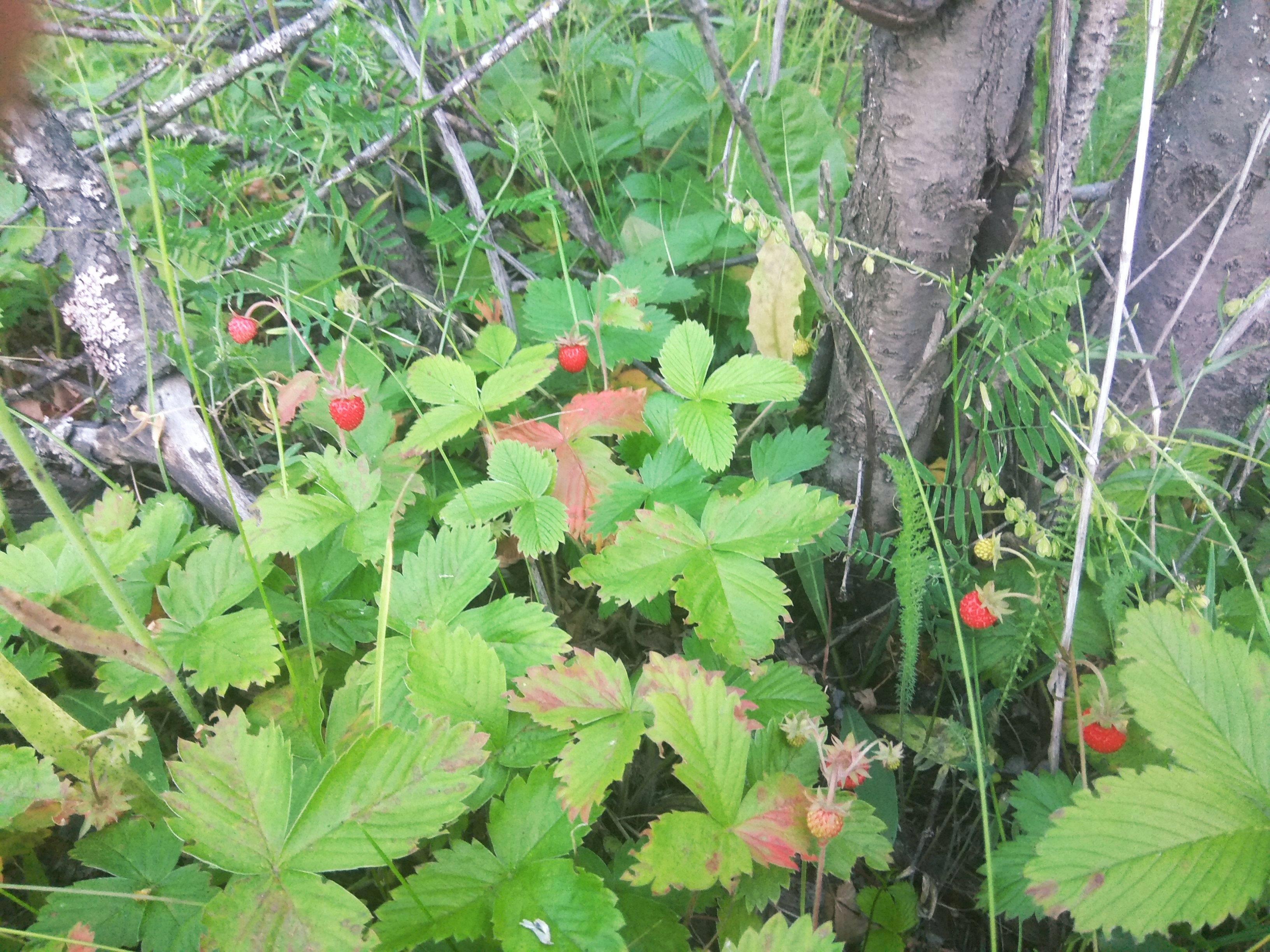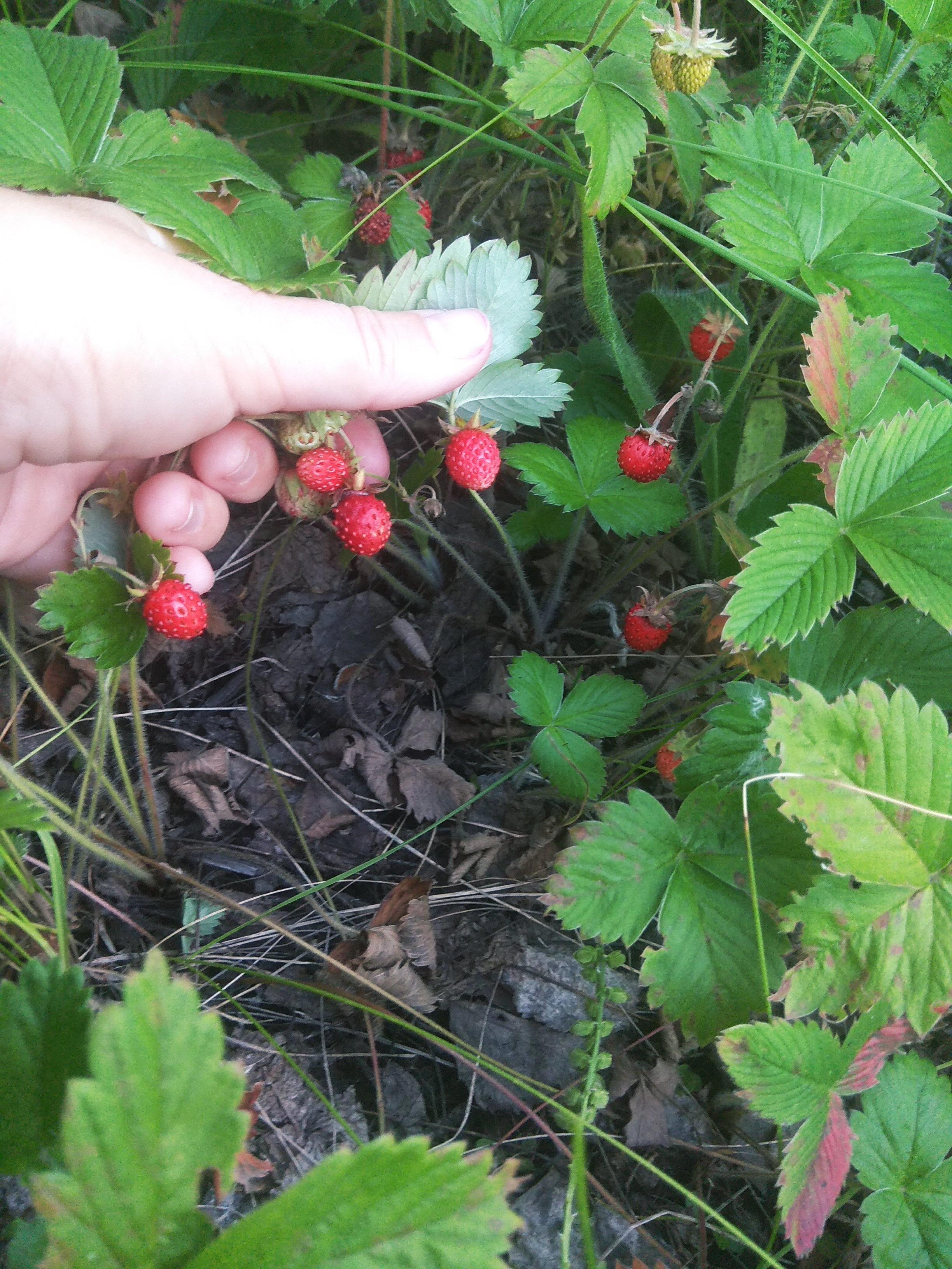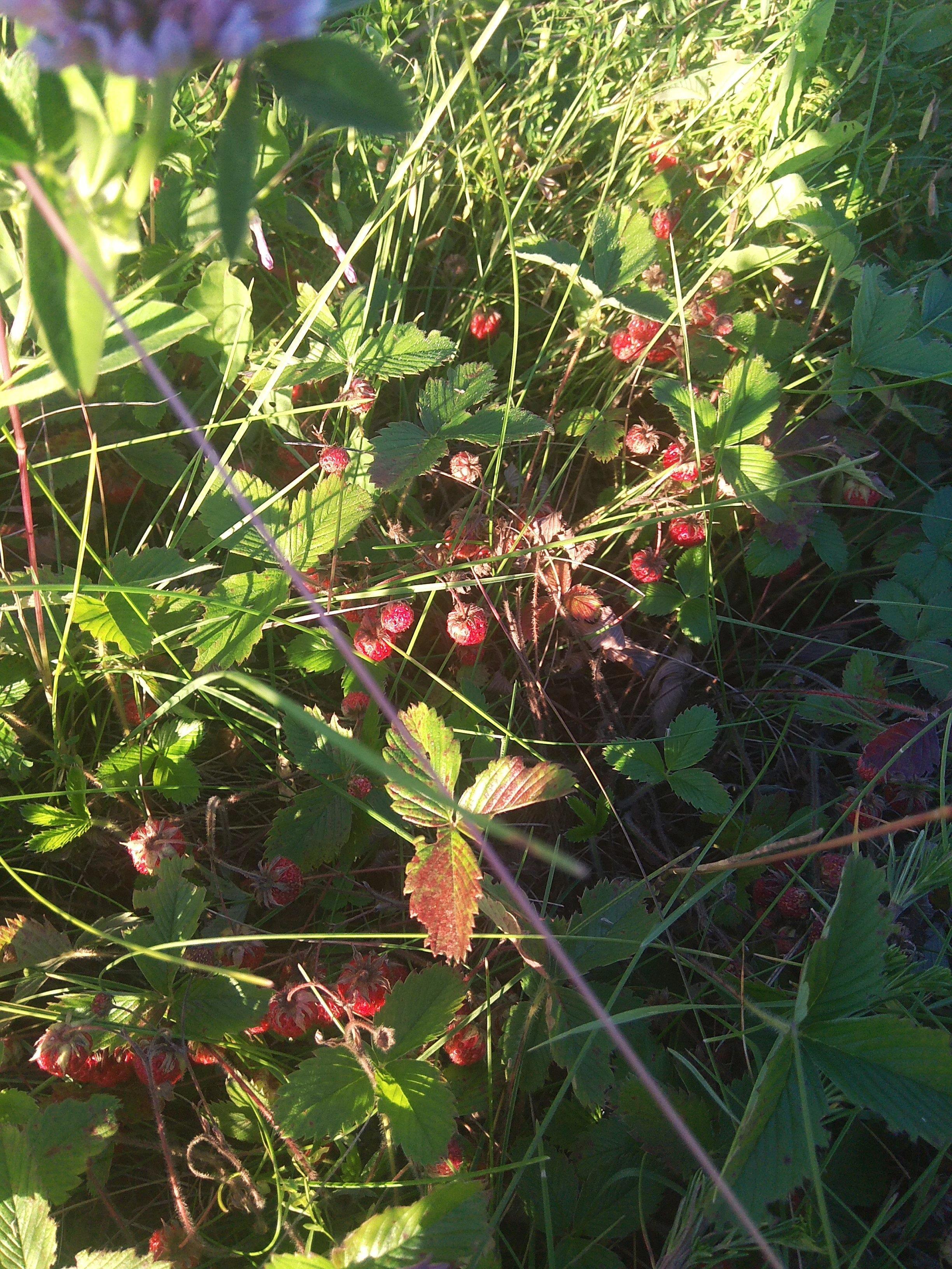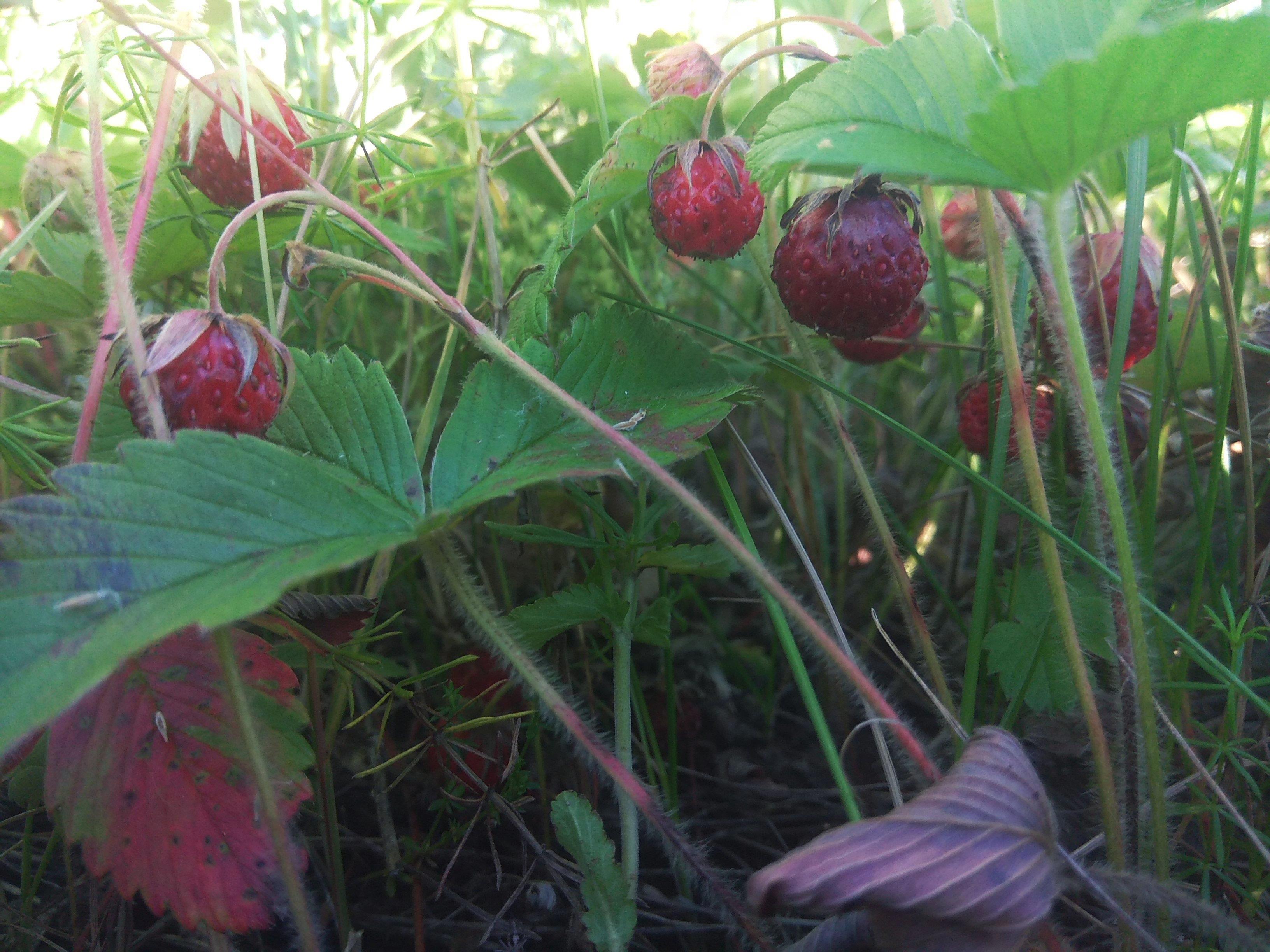 И вот под этим цветистым ковром прячутся рубиновые ягодки. Крупнее всего они на открытых куртинках, где меньше растительности и господствует земляника.