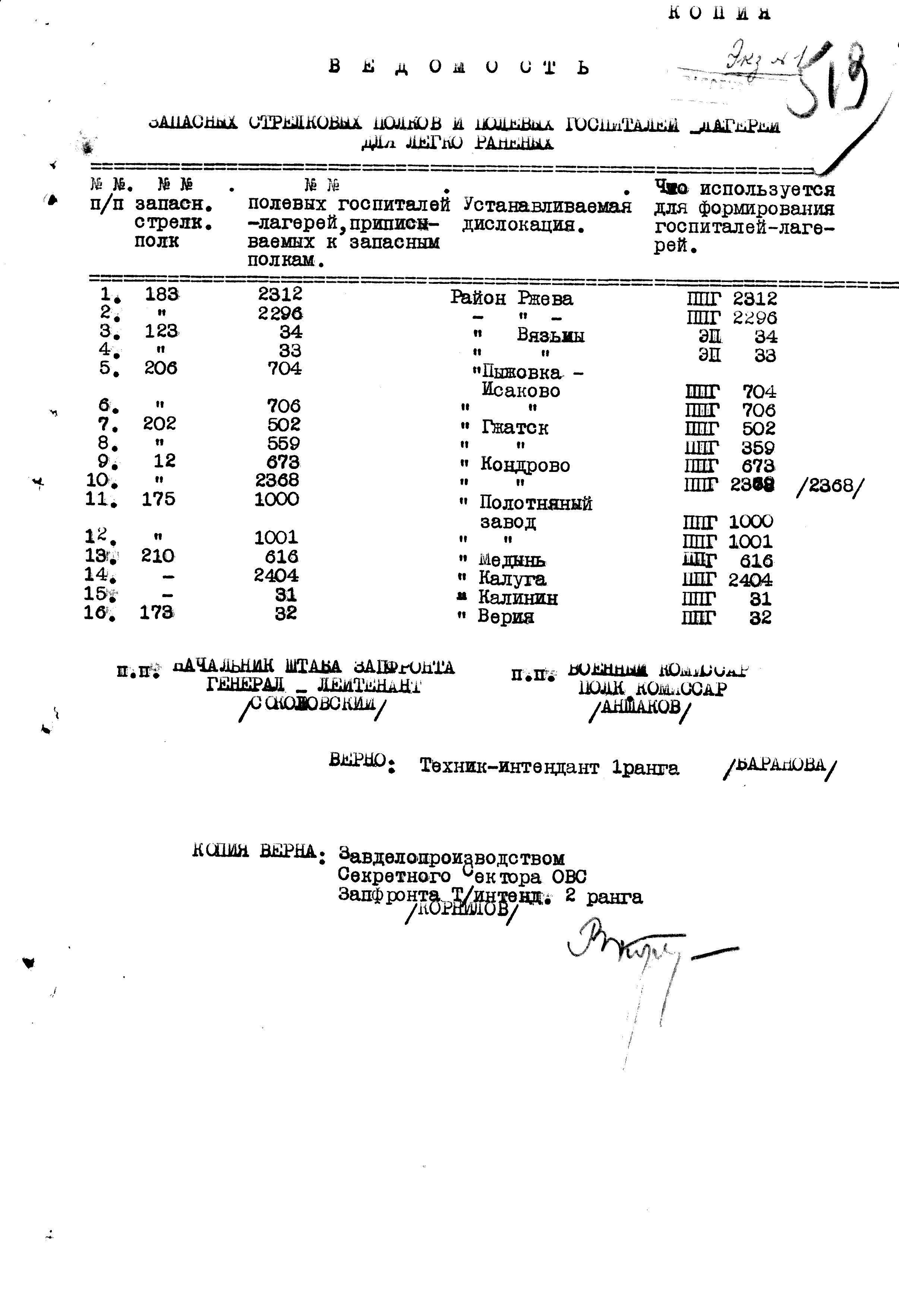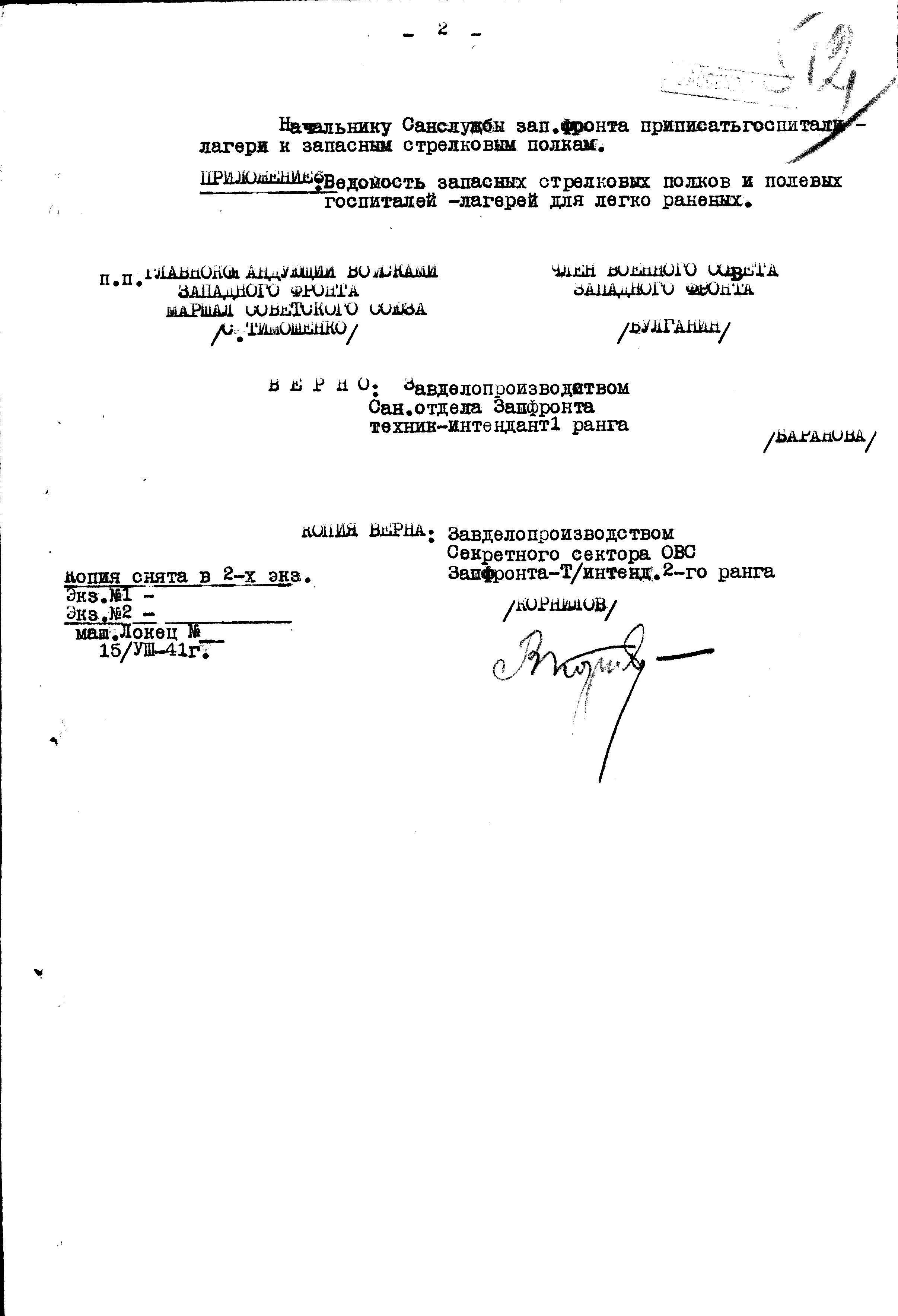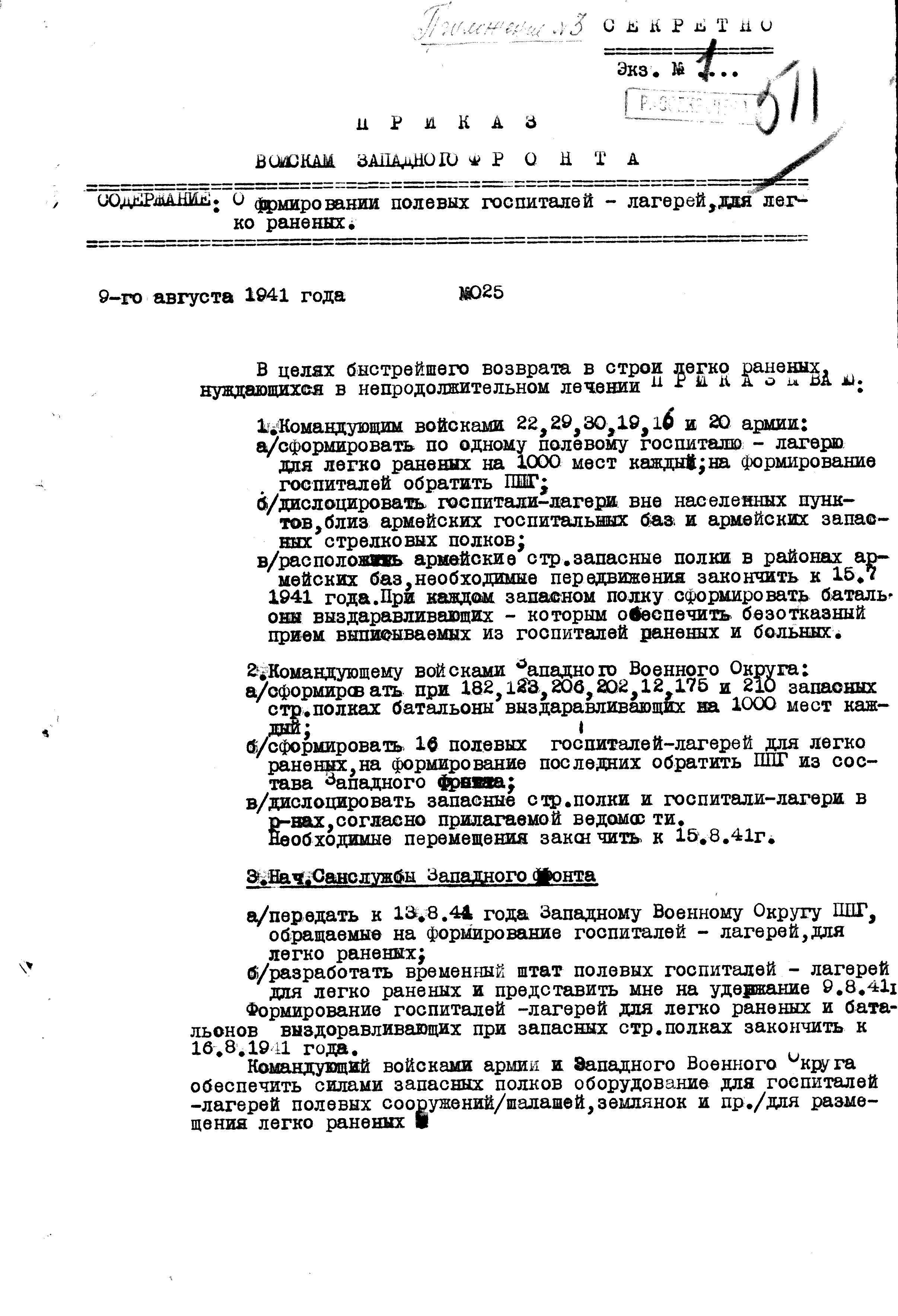 д/с: приказ Главнокомандующего войсками Западного фронта от 9.08.1941 "О формировании полевых госпиталей - лагерей для легкораненых"