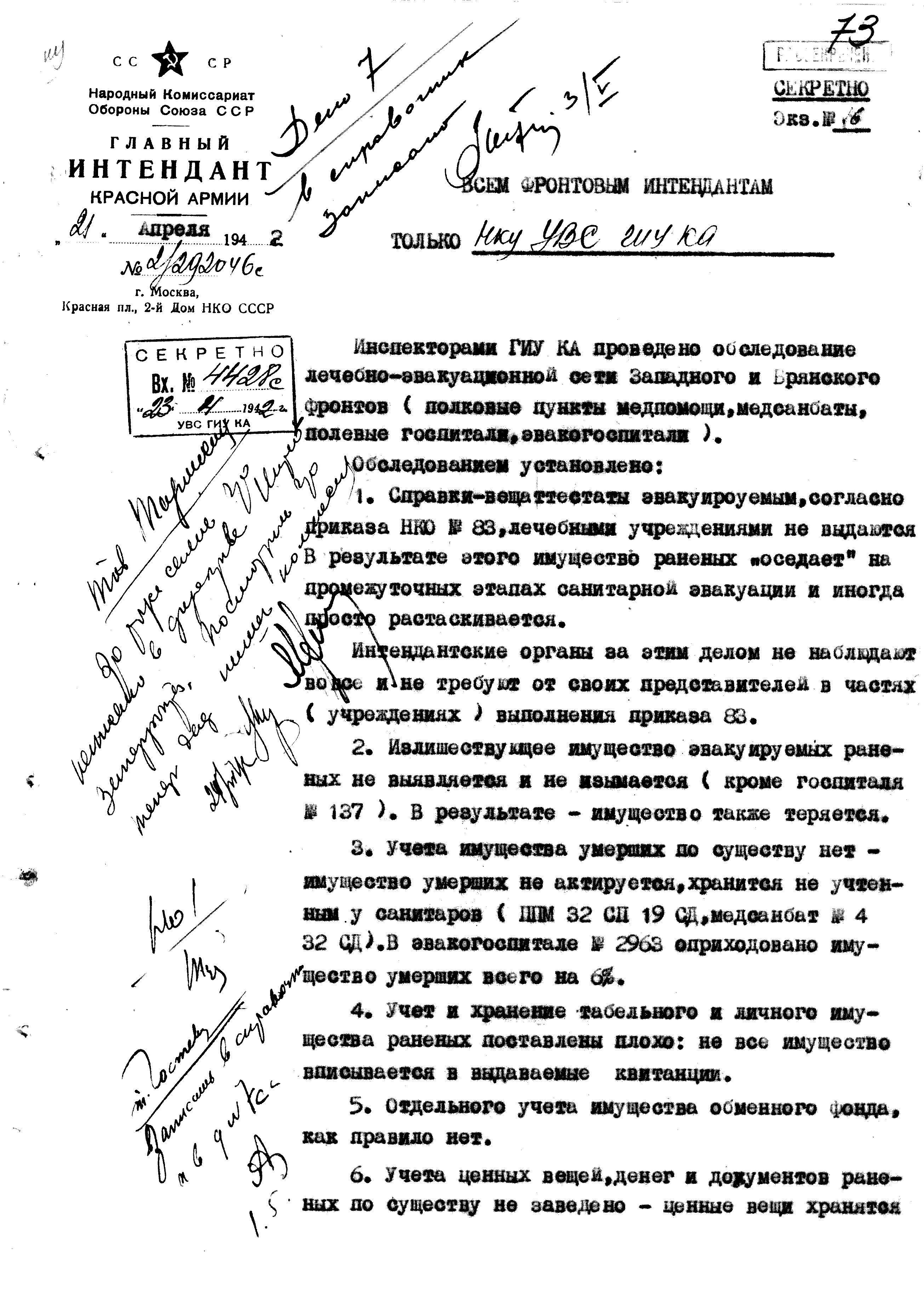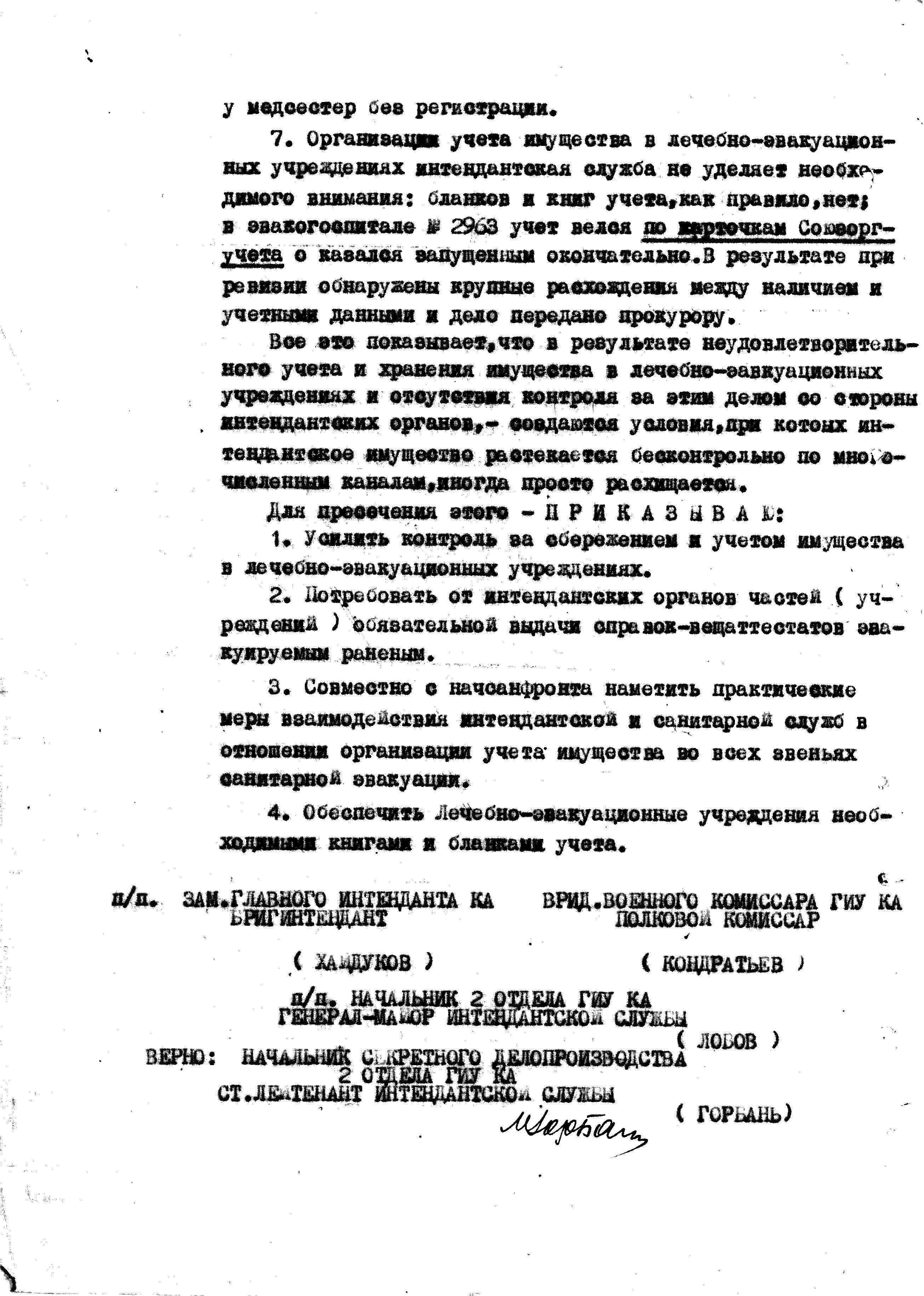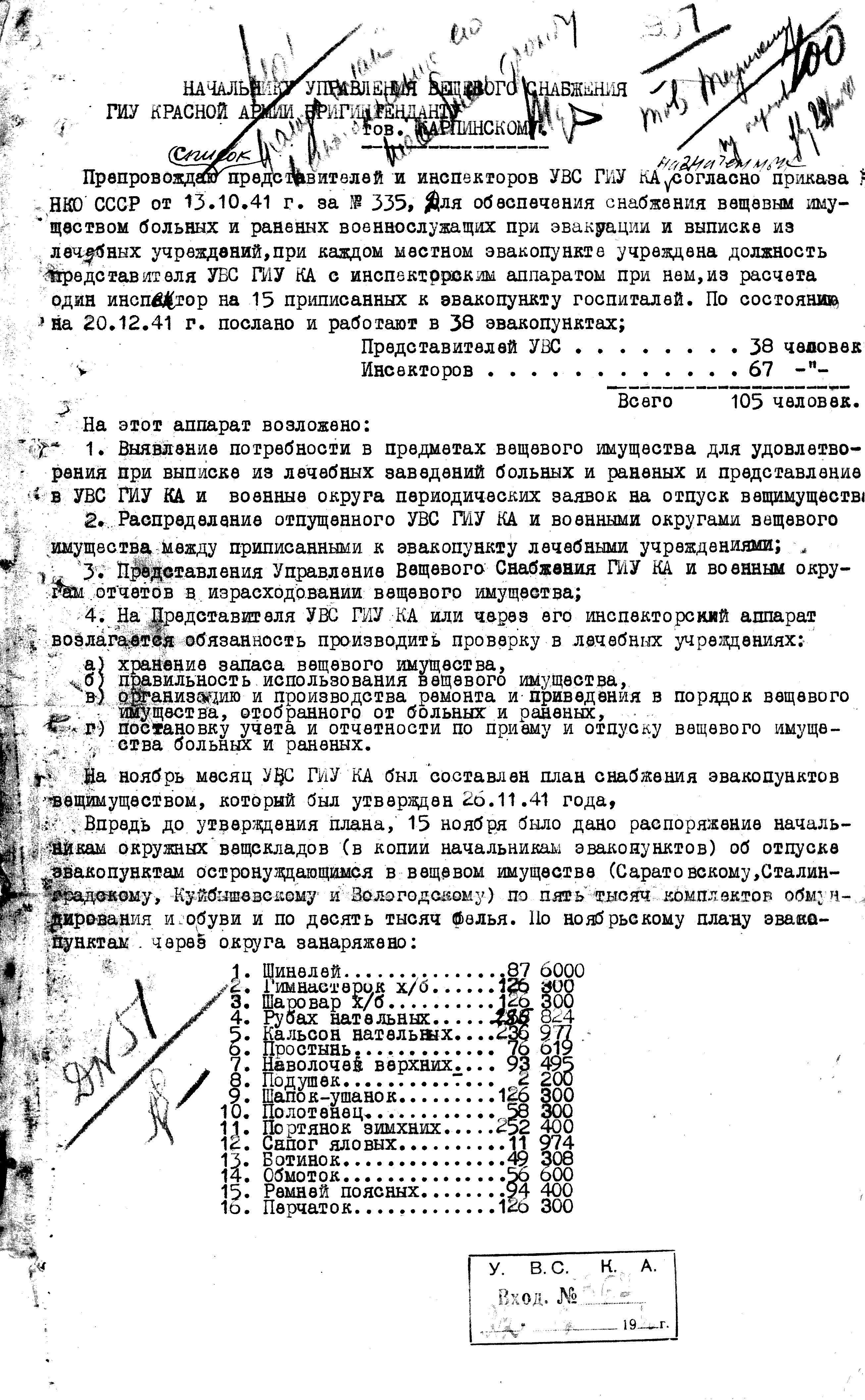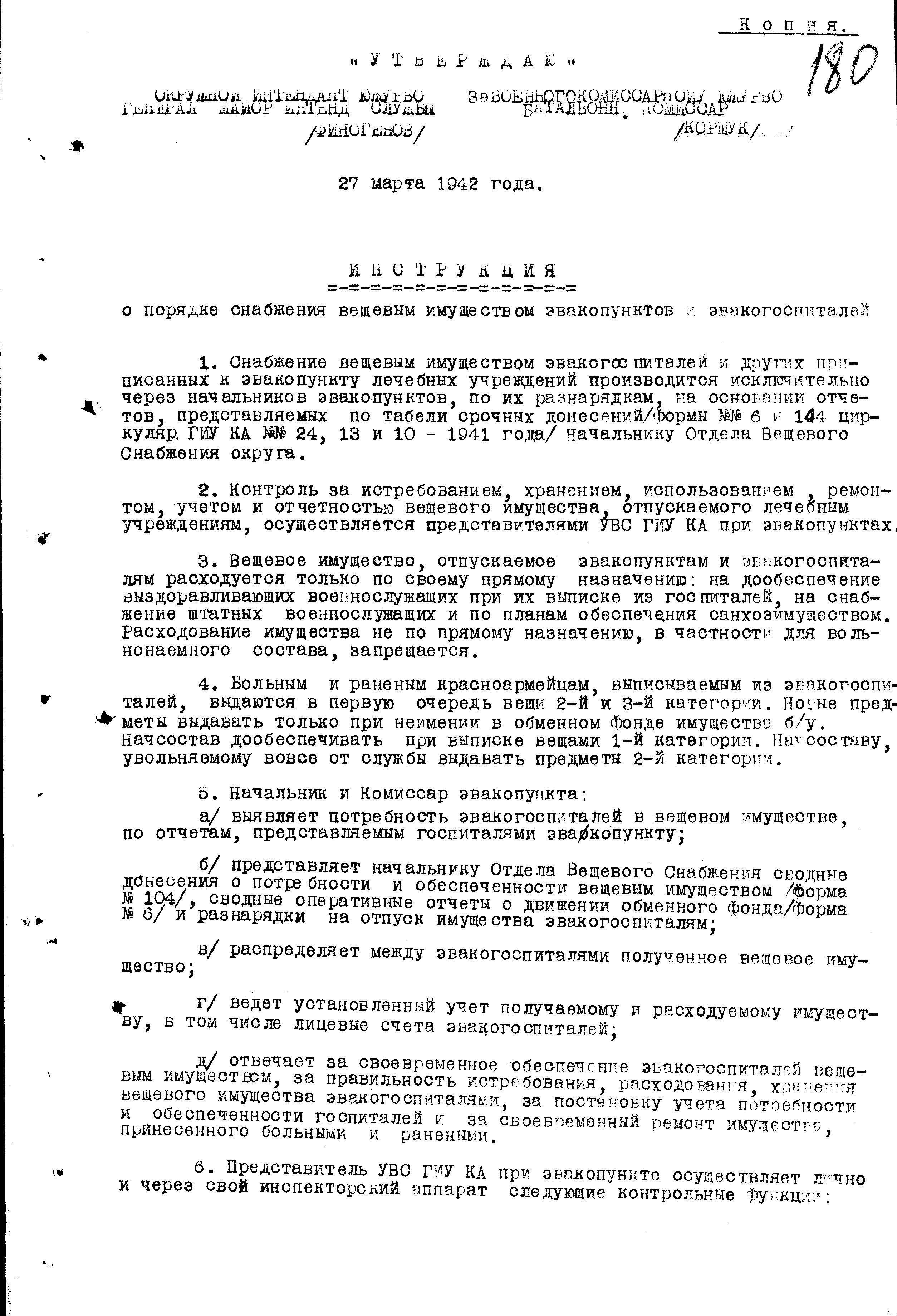 «Для организации снабжения больных и раненых вещевым имуществом приказом НКО № 335-1941 года при эвакопунктах были введены должности представителей УВС ГИУ ВС.