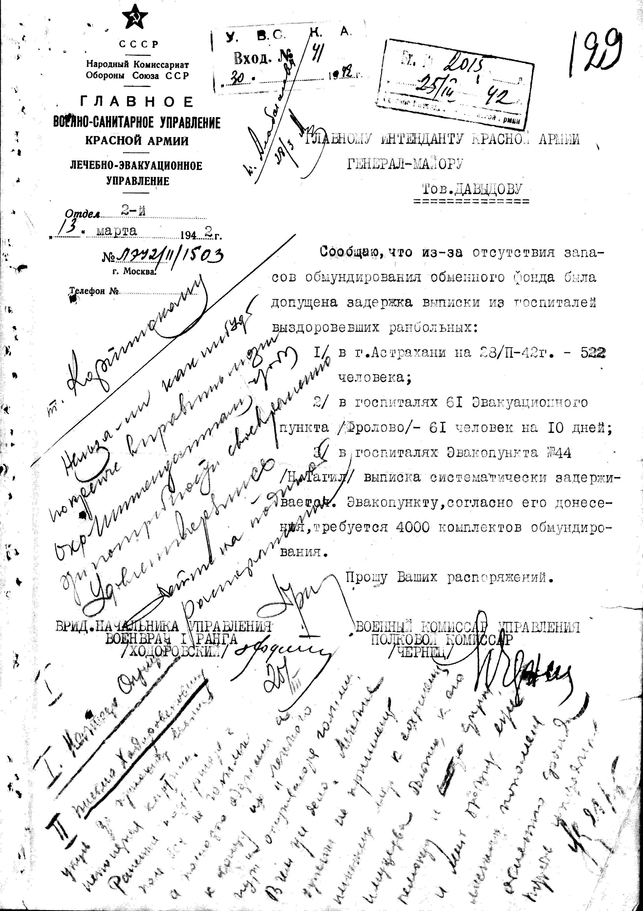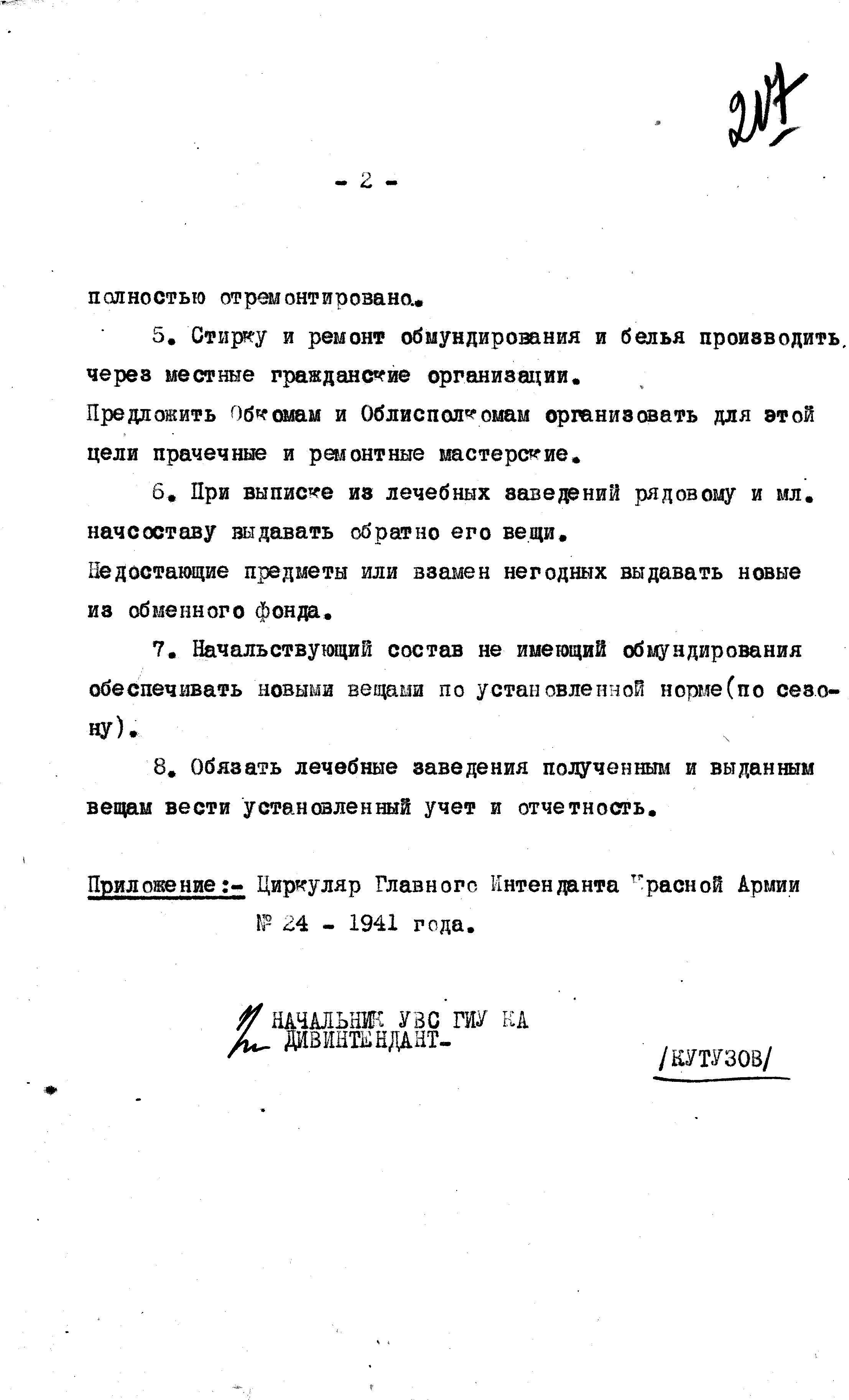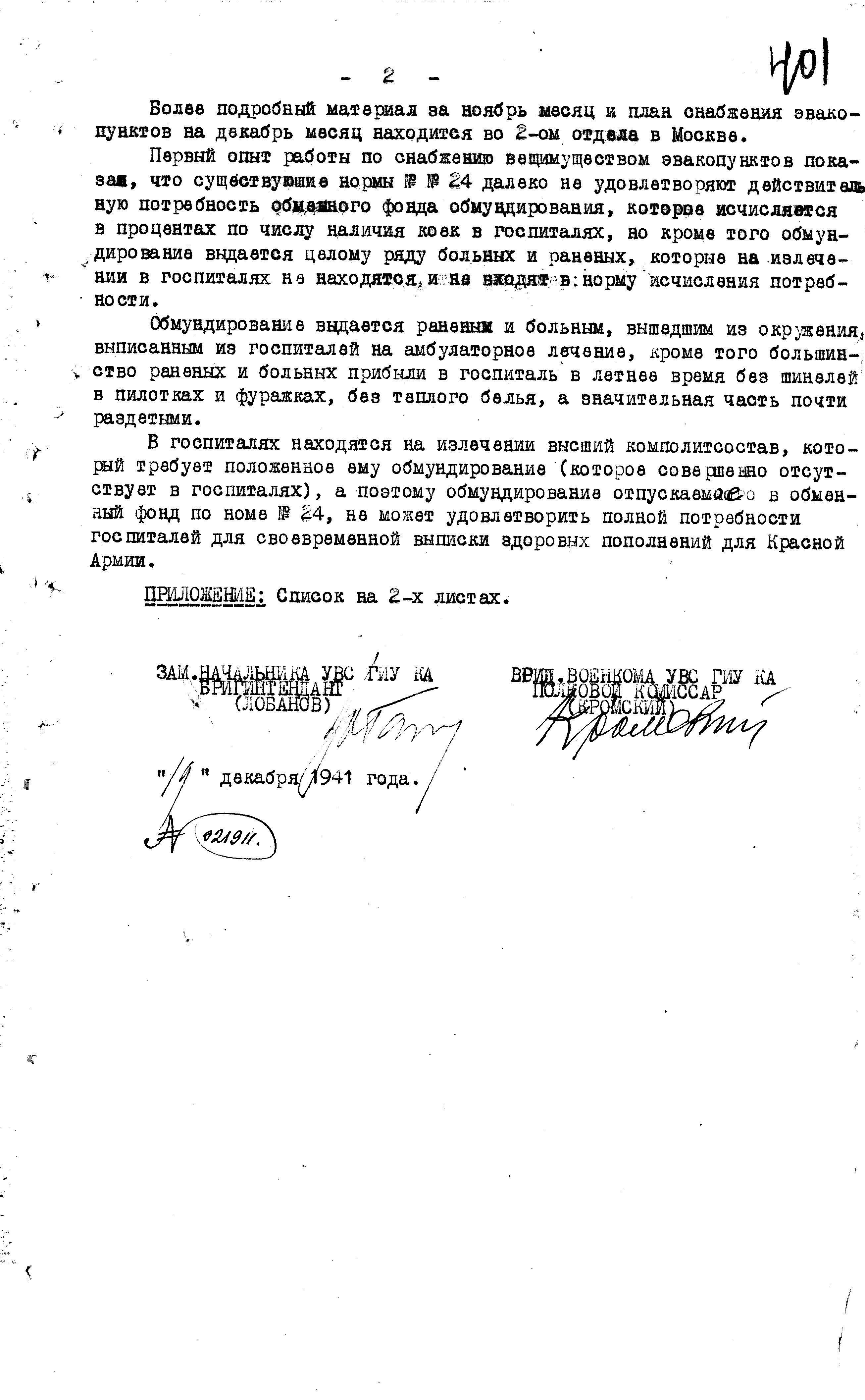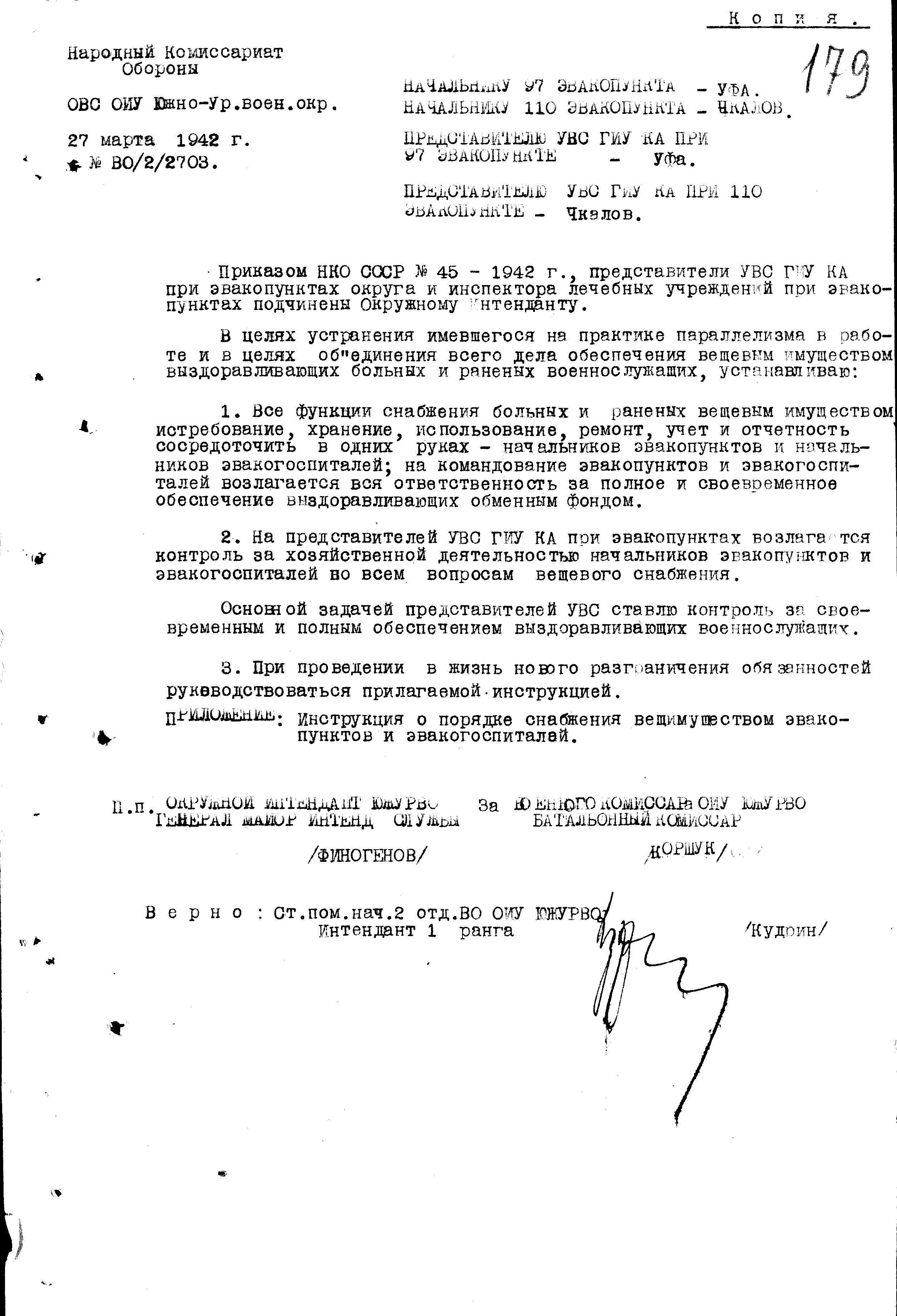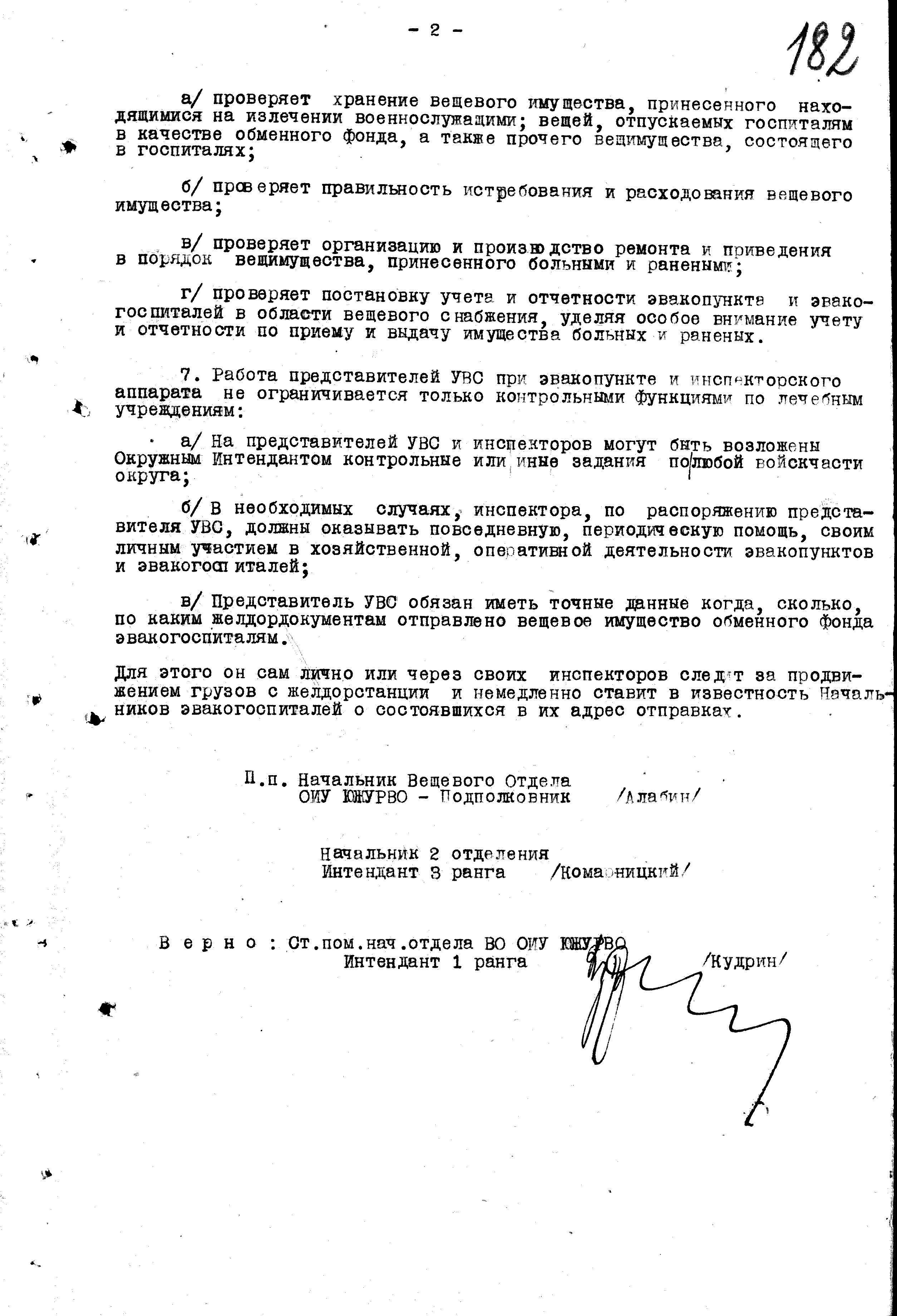 «Для организации снабжения больных и раненых вещевым имуществом приказом НКО № 335-1941 года при эвакопунктах были введены должности представителей УВС ГИУ ВС.