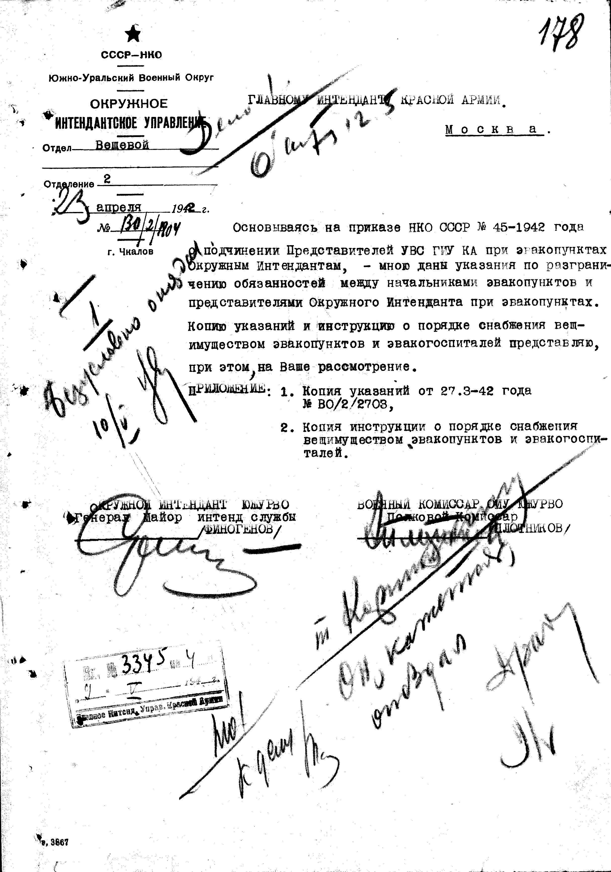 В апреле 1942 г., задача по обеспечению эвакопунктах перешла к интендантам фронтов и военных округов, при этом интенданты, назначенные на это направление, считались представителями центрального аппарата – Управления Вещевого Снабжения. Сохранились документы интендантского управления Южно-Уральского военного округа, регламентирующие порядок работы представителей УВС, поступившие Главному Интенданту Красной Армии на согласование.