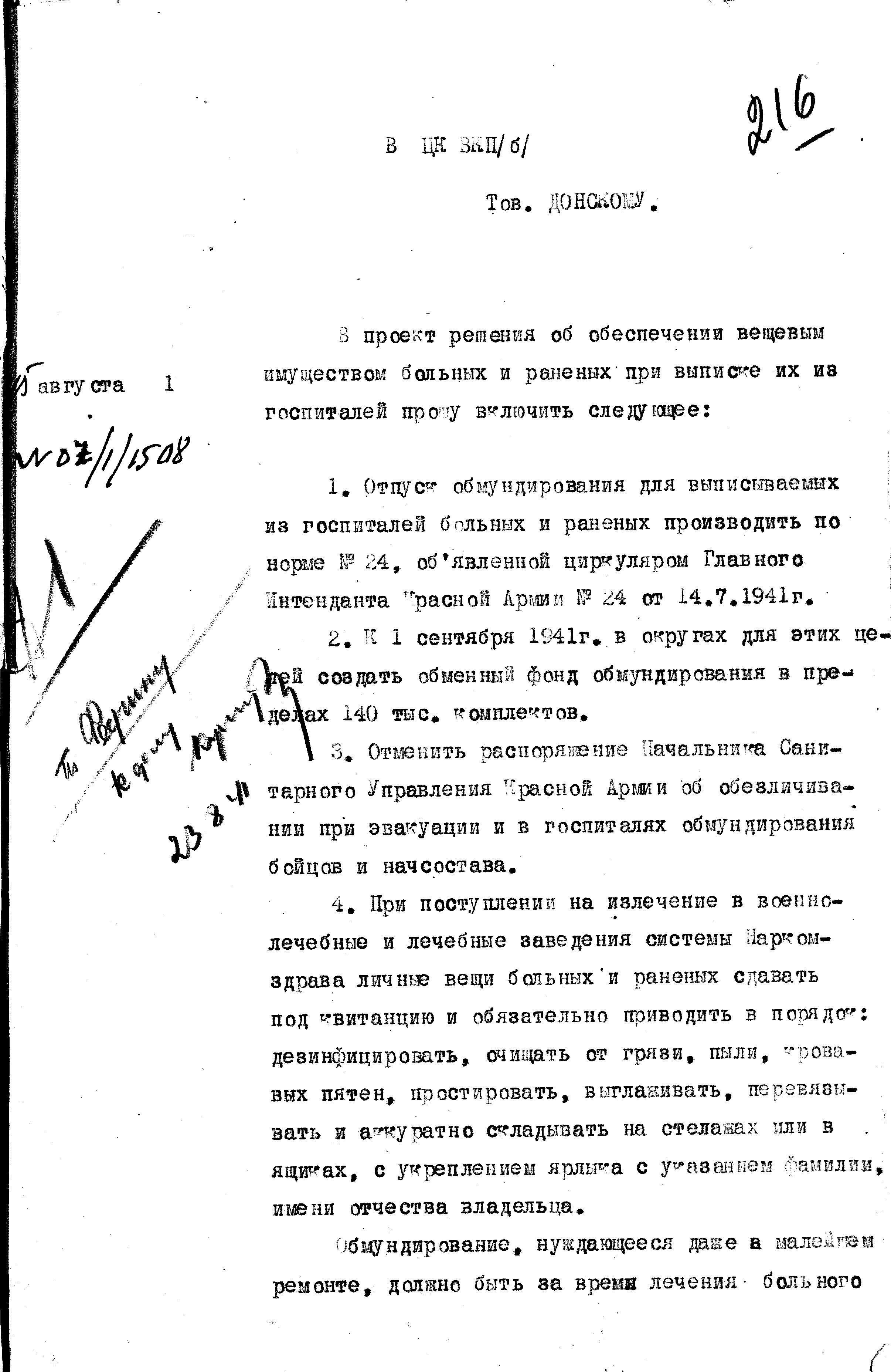 д/с: Предложения УВС ГИУ в проект решения ЦК ВКП (б) об обеспечении вещевым имуществом больных и раненых при выписке их из госпиталей