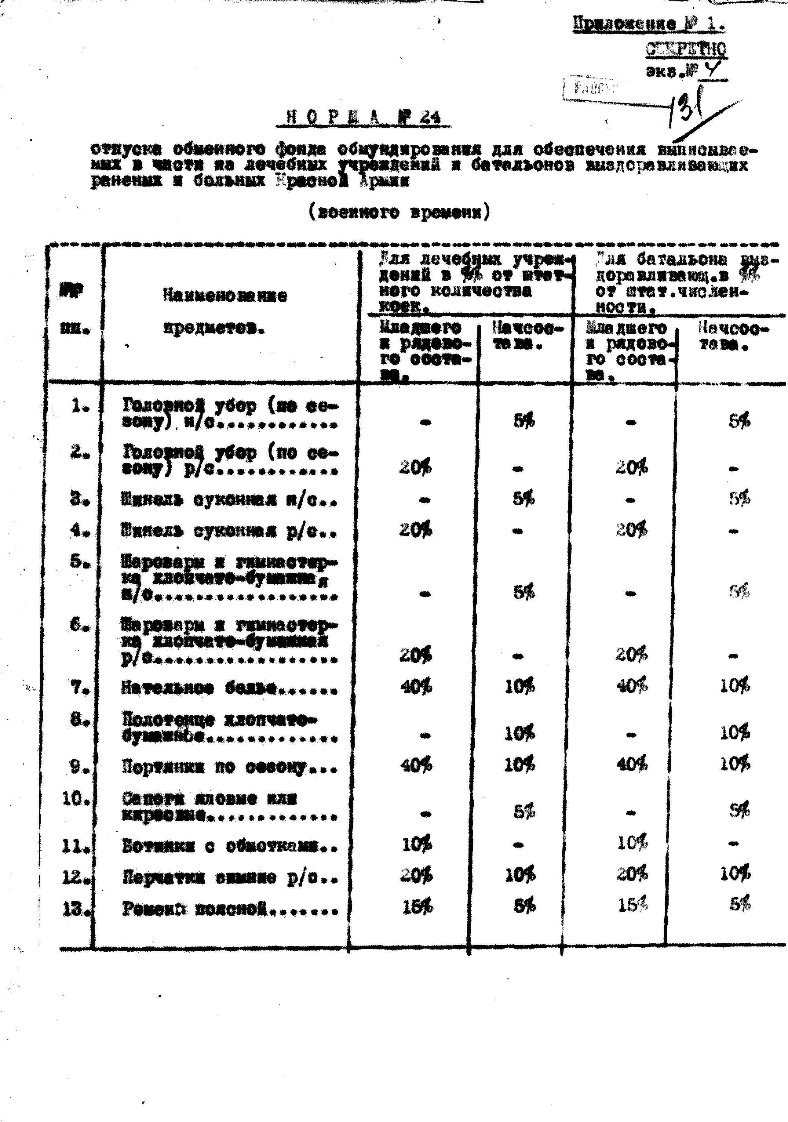 д/с: Норма № 24 отпуска обменного фонда обмундирования для обеспечения выписываемых в части из лечебных учреждений