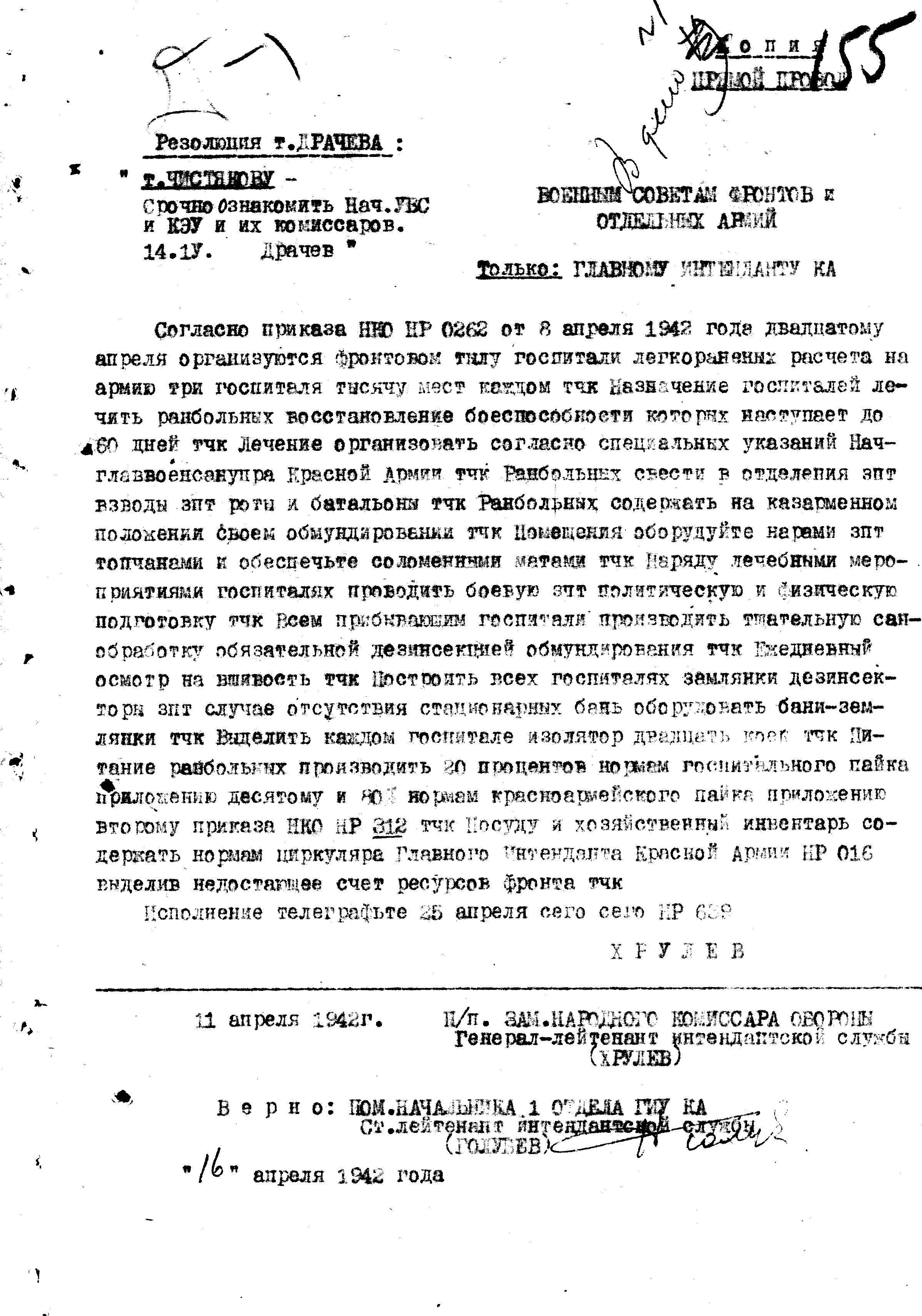 д/с: указание заместителя Наркома обороны по материальному обеспечению госпиталей для легкораненых