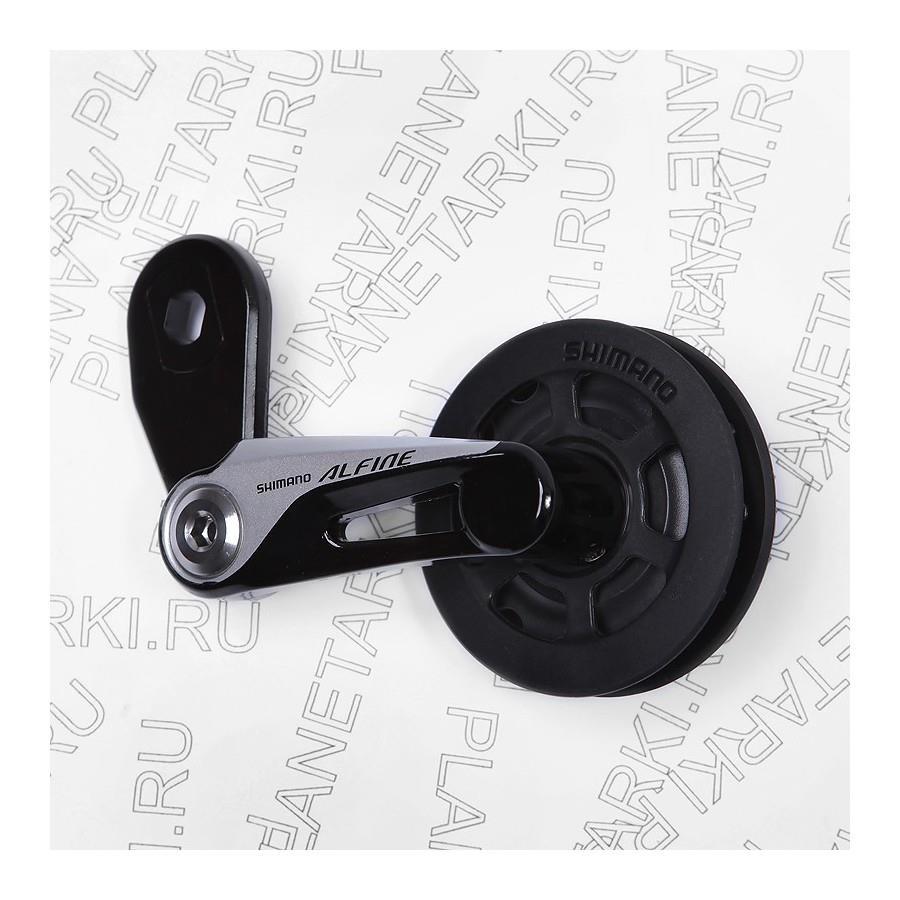 В принципе, тут есть две основные части - неподвижная база и подвижная "нога" с направляющей звездой. Неподвижная часть крепится не к "петуху", как дефолтный натяжитель, а надевается прямо на ось планетарки, чтобы исключить вращение - у шимановских планетарок вдоль оси сделаны две фаски, и в комплекте идут специальные стопорные шайбы, чтобы исключить прокручивание оси втулки (это часть функционала).