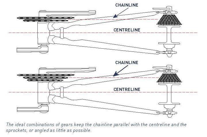 Другой нюанс оказался в таком моменте, который по-аглицки называется chainline, т.е. "линия цепи". Это условная линия между точками натяжения цепи на передней и задней звёздах. И в идеале она должна быть параллельна продольной оси велосипеда. Если этого не происходит, и звёзды оказываются не на одной линии, то, пропорционально расстоянию разлёта, возрастает и вероятность слёта цепи. Ибо её перекашивает.