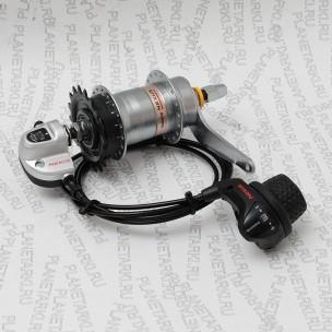 Планетарная втулка, если кто не в курсе, это такой занятный редуктор, у которого все скорости находятся внутри герметичного корпуса, в виде хитрого механизма из зубчатых колец. Снаружи - только фиксированная передача на звезде, выбранной юзером, и боковой переключатель скоростей, который может выглядеть по-разному. Если брать самые распространенные, от компании Shimano, то сейчас у них имеются на 3, 7, и 8 скоростей. На 5, к сожалению, уже не выпускают.