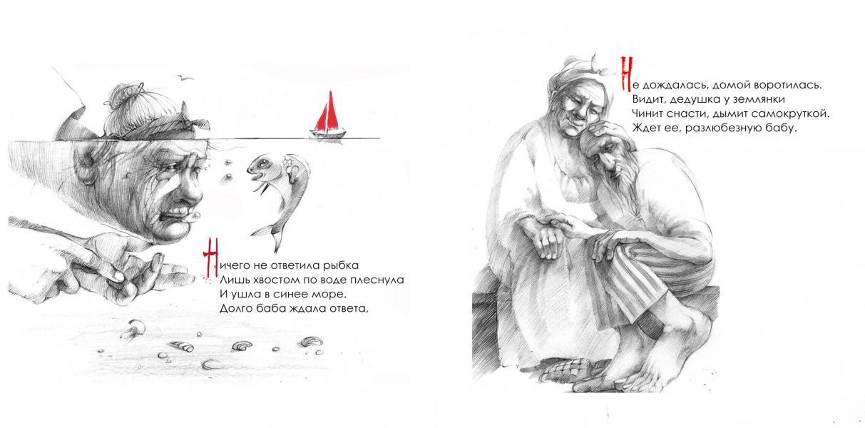 Подпись под иллюстрацией: "Макарова Юлия «Серия иллюстраций к произведению “Сказка о рыбаке и рыбке” А. Пушкина»".