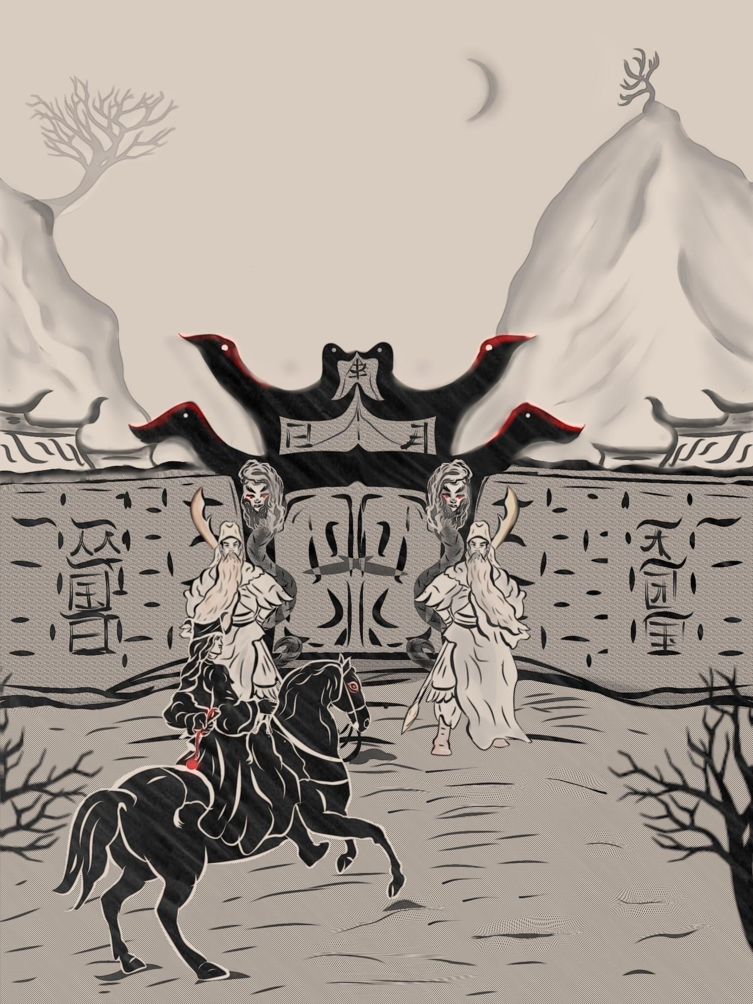 | 1) Препирательство у восточных ворот столицы (когда глаза у каменных хранителей погасли): | 2) В области Ци провожают старый год (вместе с барсами, которые всё равно придут в новом году): | |