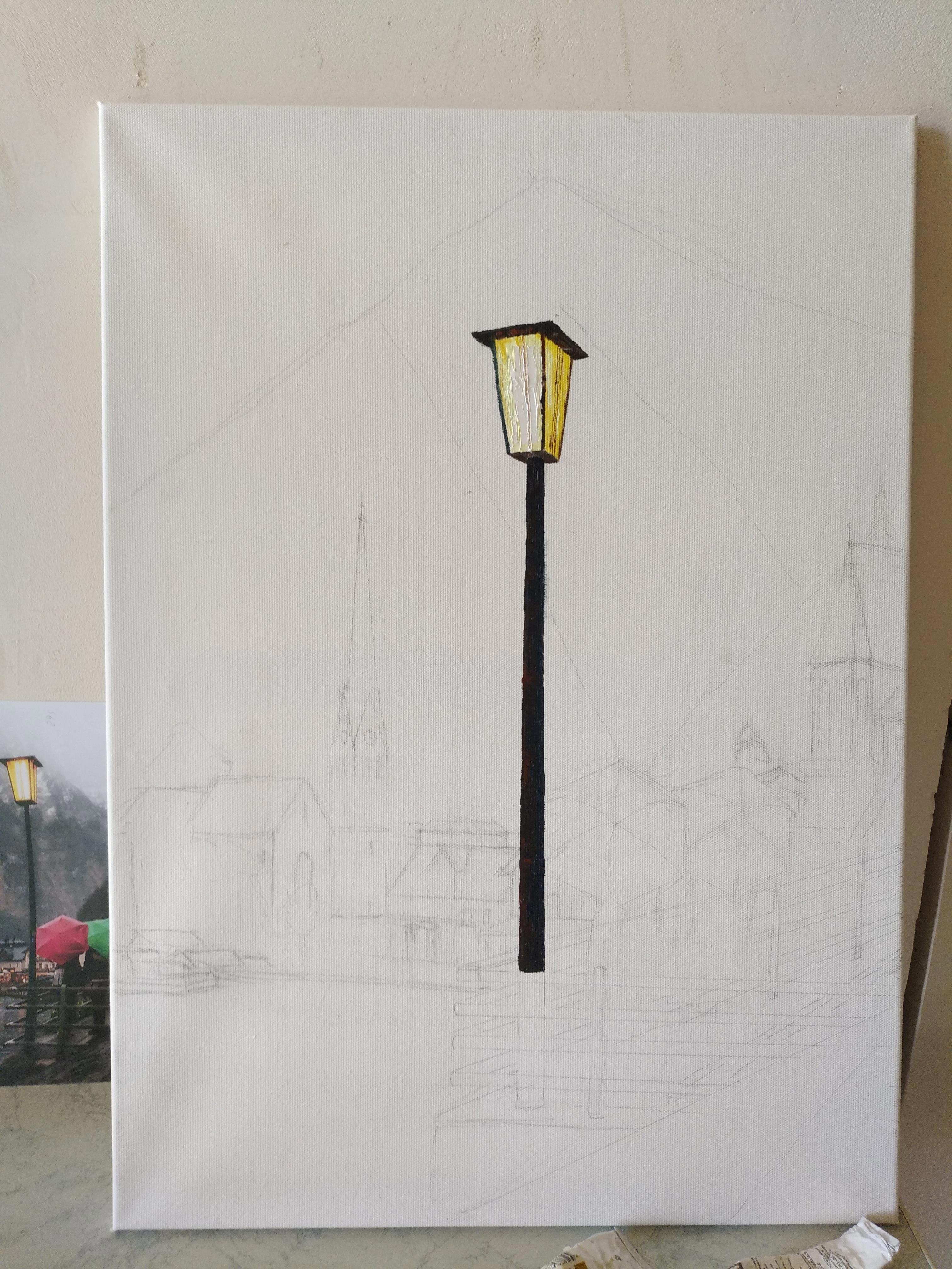 2 Ставим фонарь. Хотя вероятно его стоило как раз в последний момент писать, а то потом пришлось обрисовывать. Но вот не давал он мне покоя своим первым планом. В общем я художник, я так вижу. Знакомьтесь, фонарь!