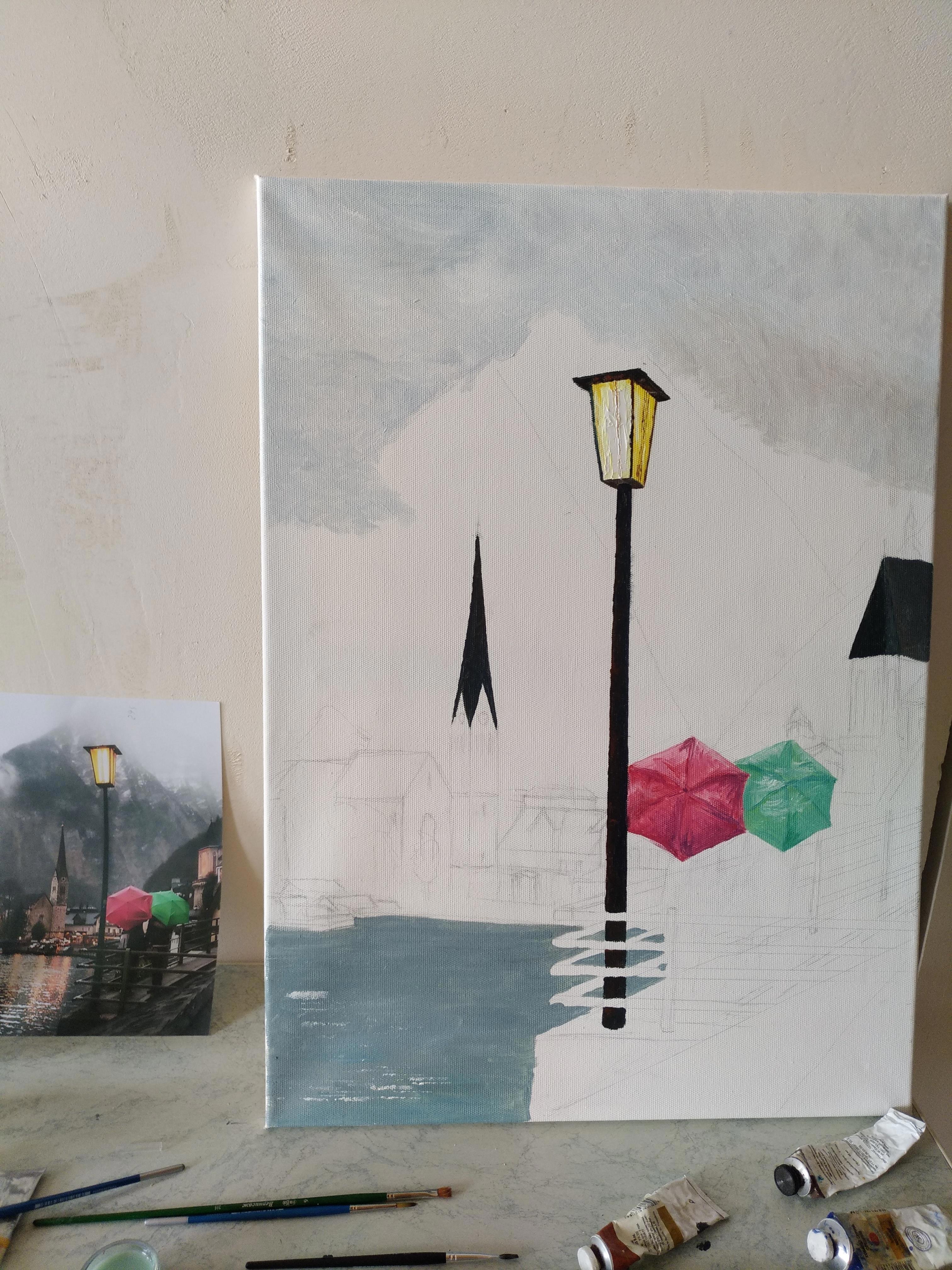 3. Пишем дальше. Дальше не дают покоя яркие зонты. Итак, знакомьтесь, зонты! (ну и небушко с водой намечаем)
