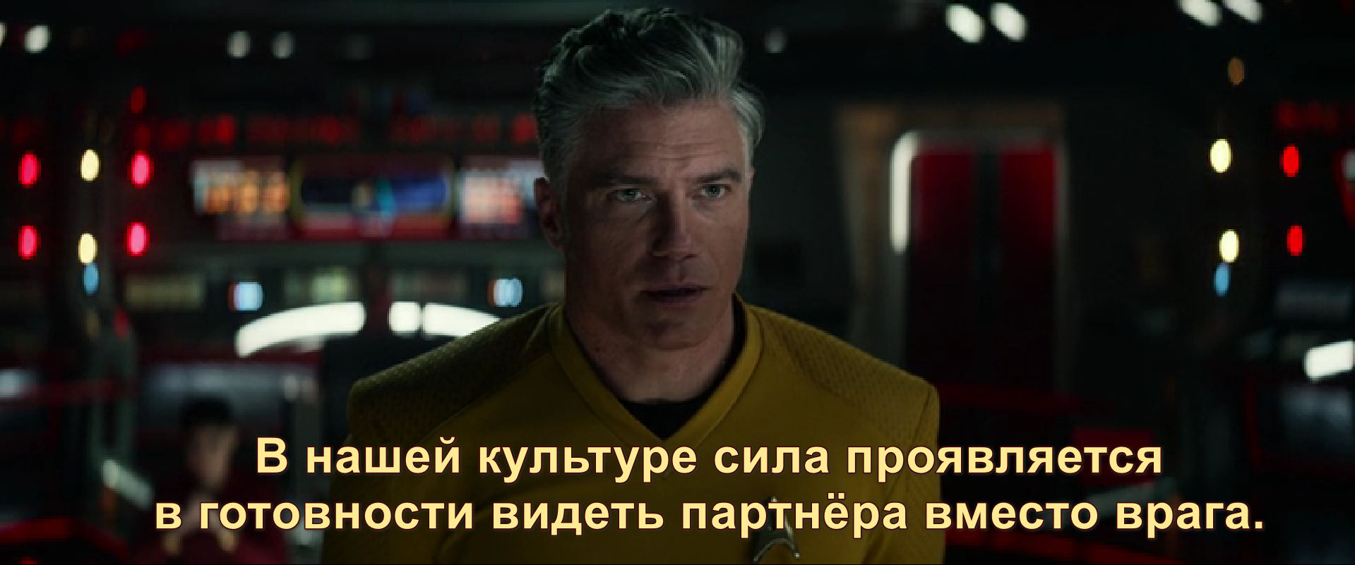 Перевод мой. Но я даже не погрешила выбором слов. Ирония, разумеется в том, откуда проистекает эта фраза. Не такой уж и разный менталитет, если брать абстрактно. Хотя Пайк, безусловно, в отношении широты души - просто лучший кэп всей франшизы. Я уж и не верила, что в наше время они смогут родить подобного персонажа. Всё-таки, по сравнению с 60-70-ми годами прошлого века, нынче в моде мрачный грязный декаданс.