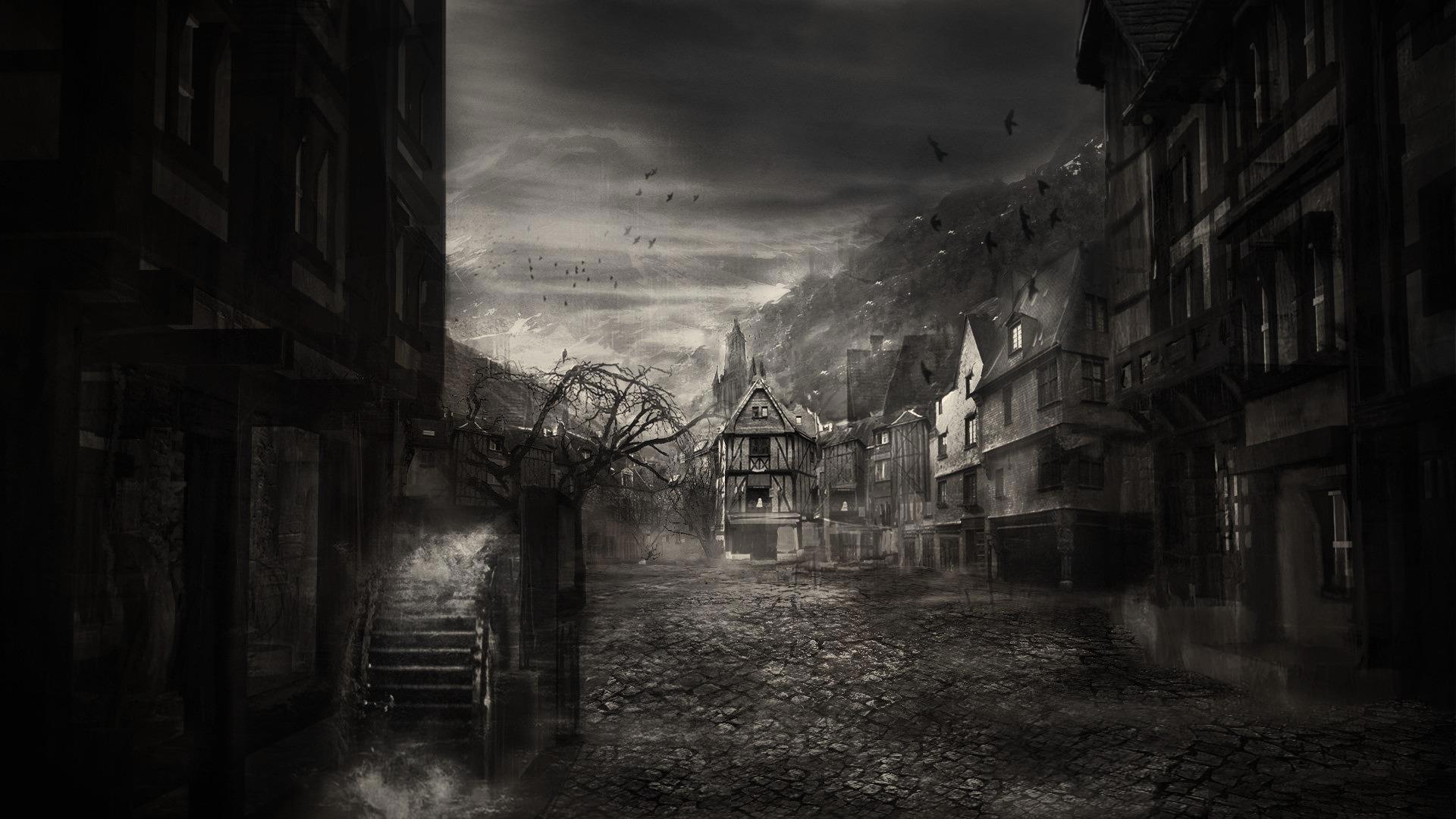 Чёрный туман рассеялся, выпуская их на площадь в центре городка. Чистое небо заволокли коричневатые тучи, сгустки чёрной массы всё ещё стояли за их спинами. Видимо, они и поглощали звуки. Стоял чёрный день.