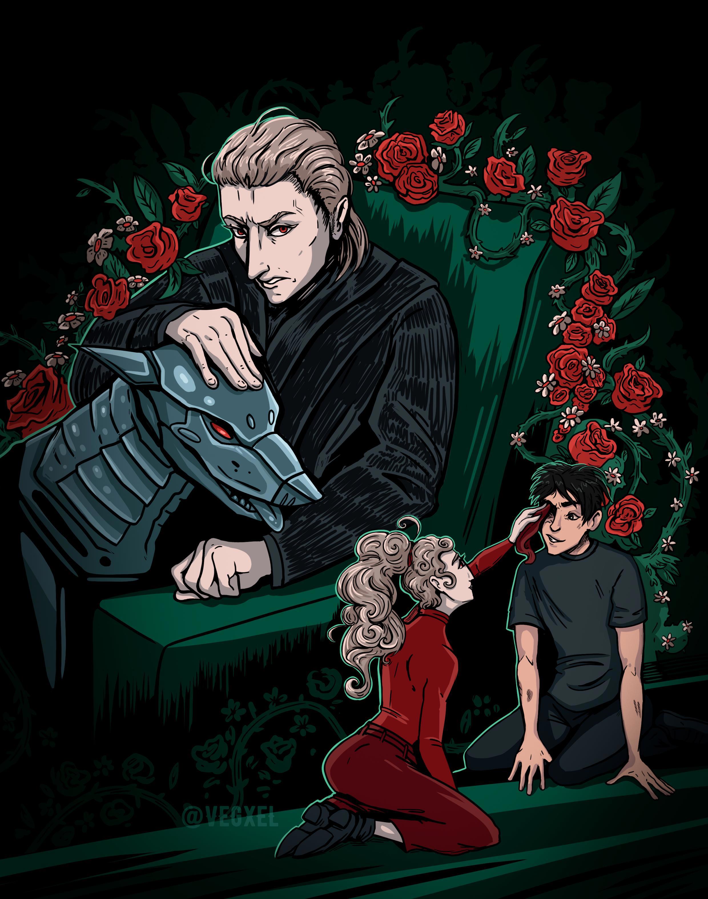 Арт по книге "Мрачные сны Атросити". Даже не знаю, что я хотела вложить в этот рисунок. Может быть, щепотку ревности в персонажах, которой в книге не было? Сложно сказать, иногда в голове рождаются образы, и не всегда знаешь, к чему они и зачем.