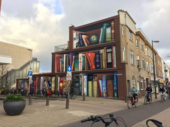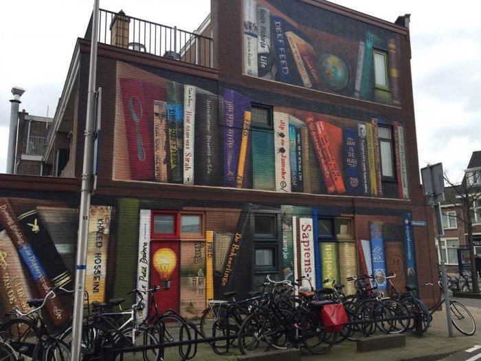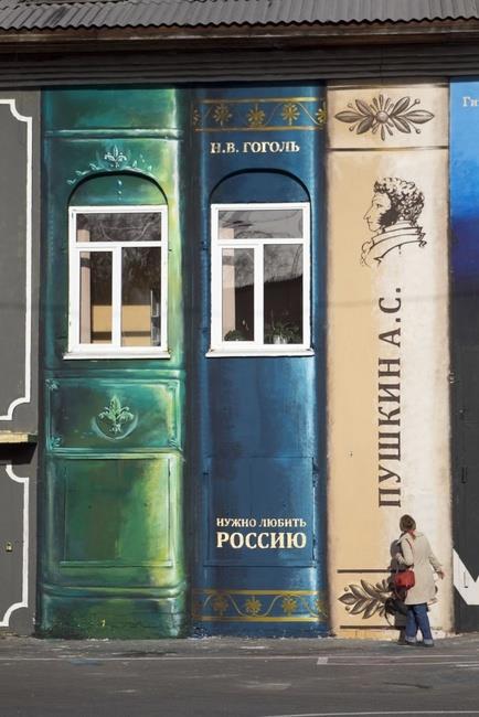 Вот еще похожий пример, отрадно заметить, что из России. Это здание гимназии в Тюмени арт-группой «Цвет города». Серое здание, выходившее фасадом в школьный двор и создававшее в нем весьма унылую обстановку, превратилось в книжную полку.