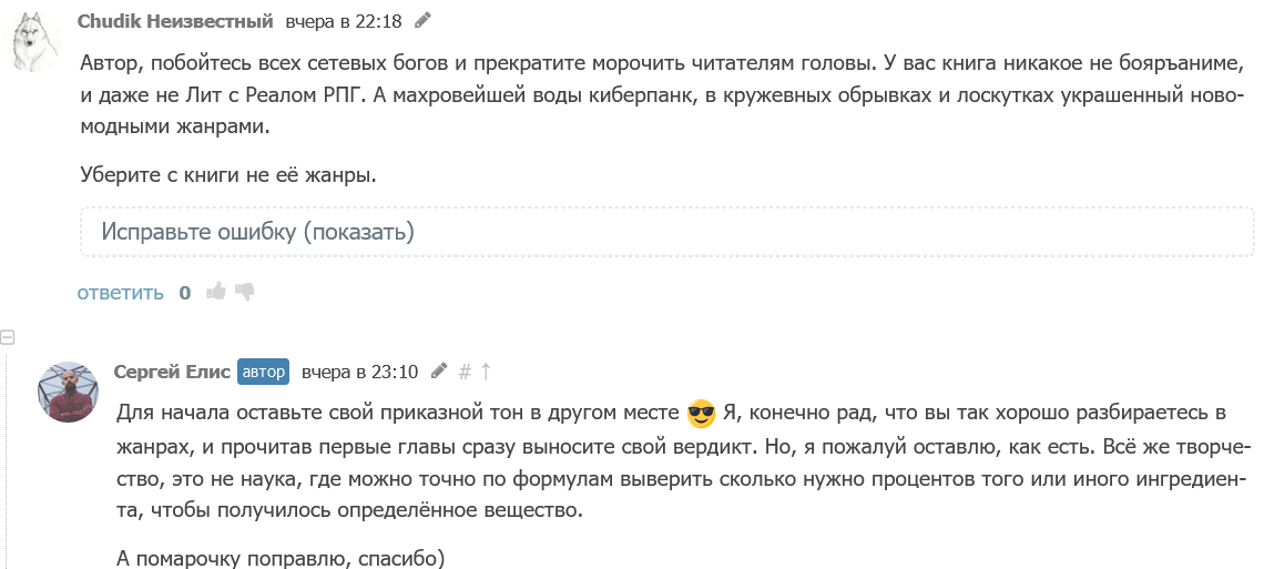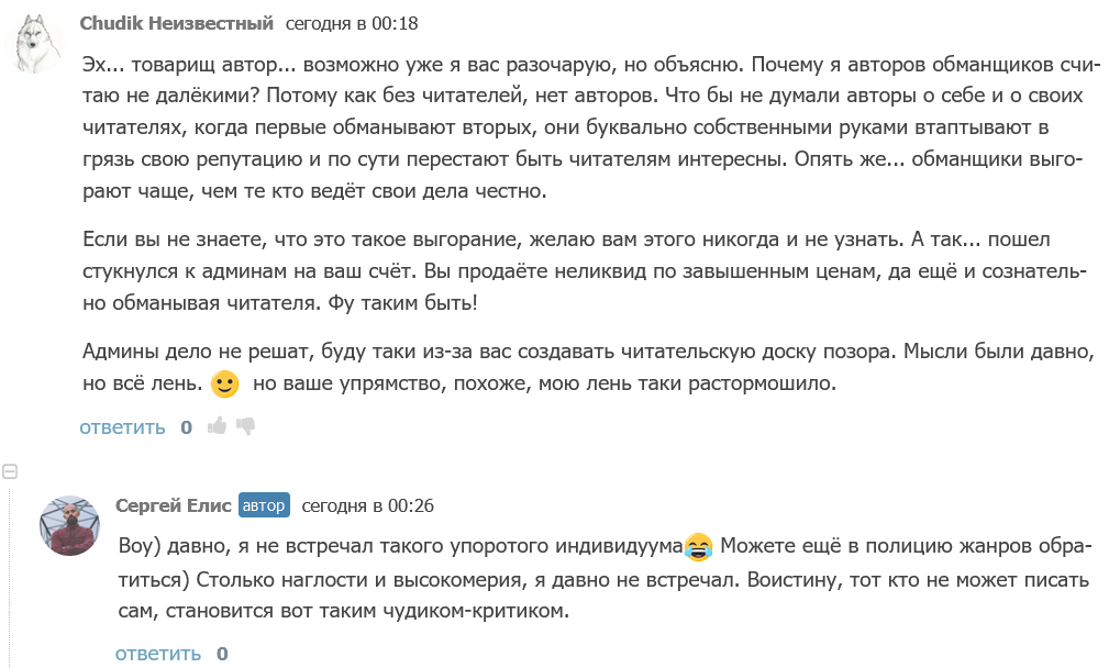 Чтобы вы делали, если бы к вам под книгу ввалился такой "чудной рыцарь" и стал требовать изменить жанры вашей книги, потому что, он видите ли видит их по-другому? А потом ещё обвинять в обмане, хамить и .....внимание, угрожать пожаловаться админам на такое непотребство.