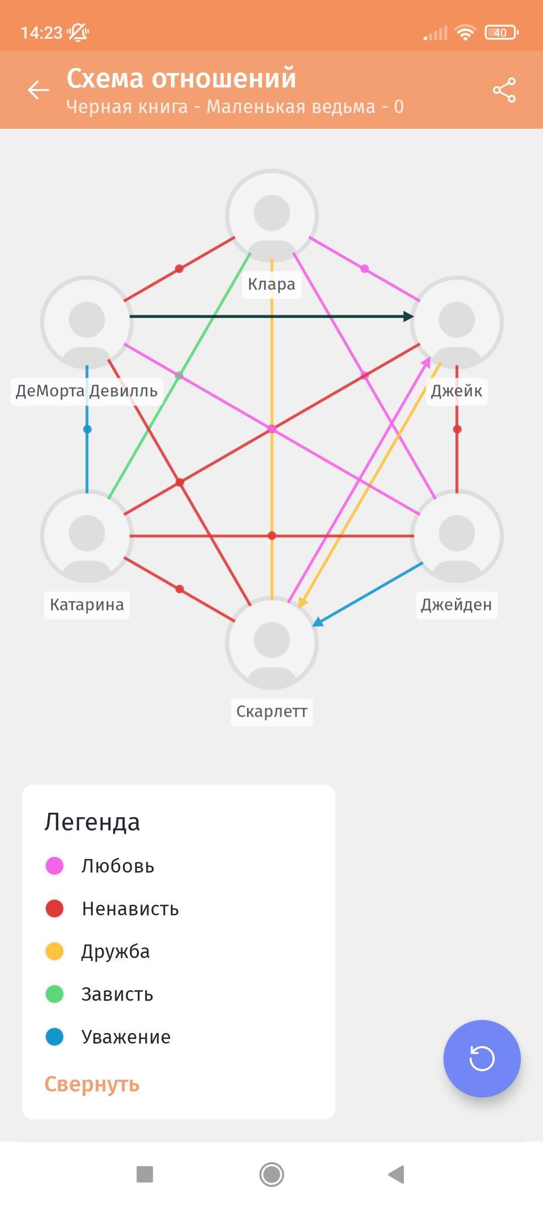 Вот такая вот схема отношений получилась у меня в программе Fabula. Смотрите, но главное не запутайтесь, а то тут все очень сложно.