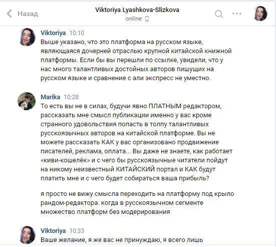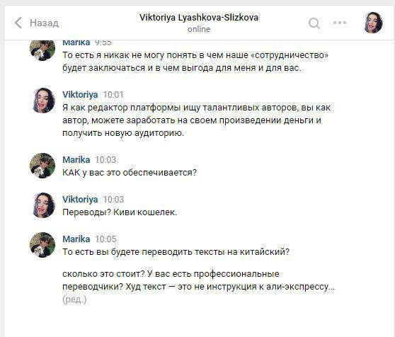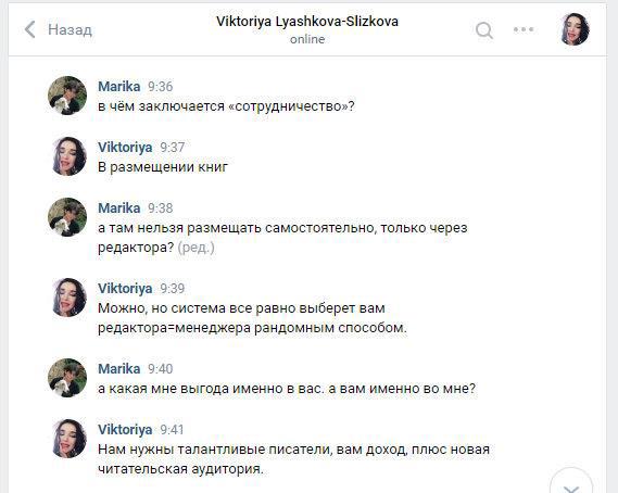 Автор: Marika StanovoiДавненько не было и вот опять. В ВК постачалась ко мне дама Ляжкова-Слизкова с вдохновляющим предложением стать моим редактором. К сожалению при развитии дискуссии из дамы выклюнулся обычный ноумейм зазыватель на очередной стрёмный литпортал. где талантливые авторы могут неясно как заработать кучу денег в киви кошелёк.