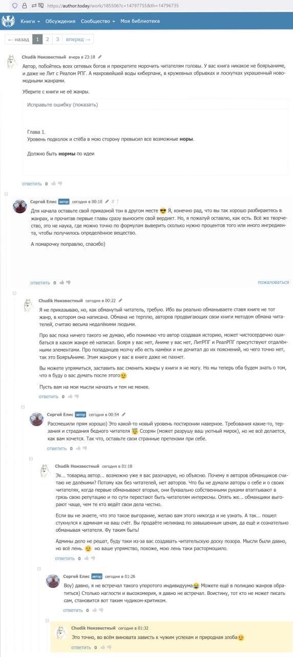 Закусился я с автором под книгой на почве смены указанных жанров. Таки он сразу сказал, что по сути плевать хотел на мнение читателя и пофиг ему на любые требования от них. Снять обманку с платной книги категорически не пожелал.