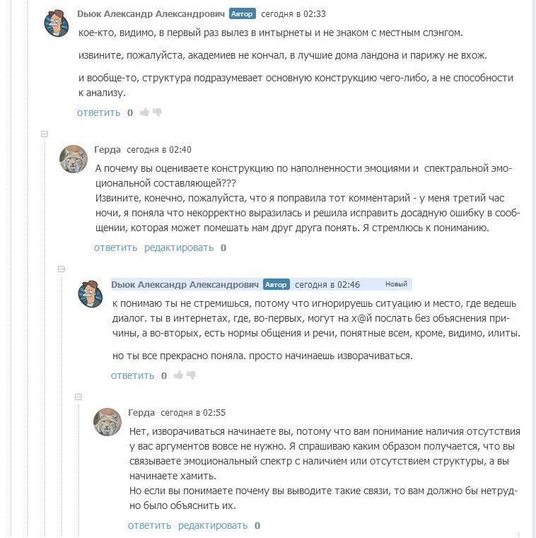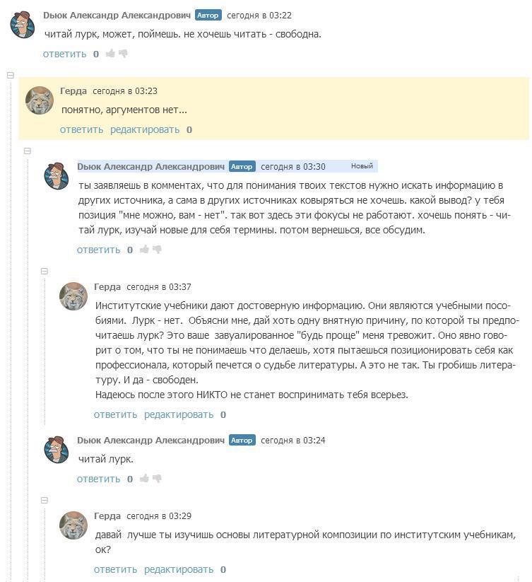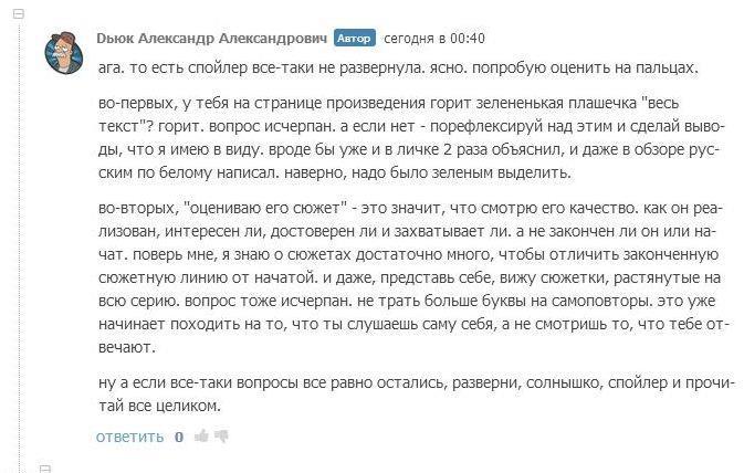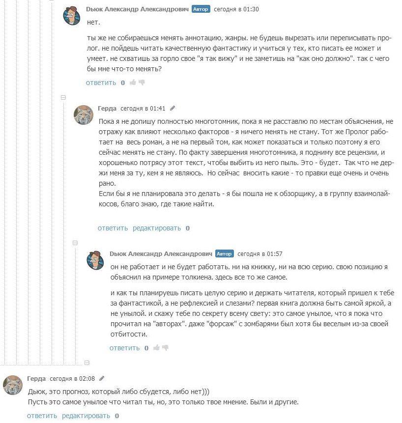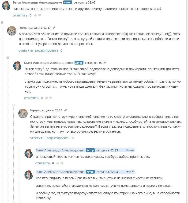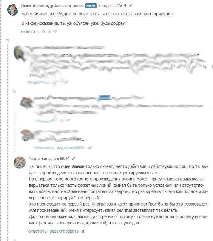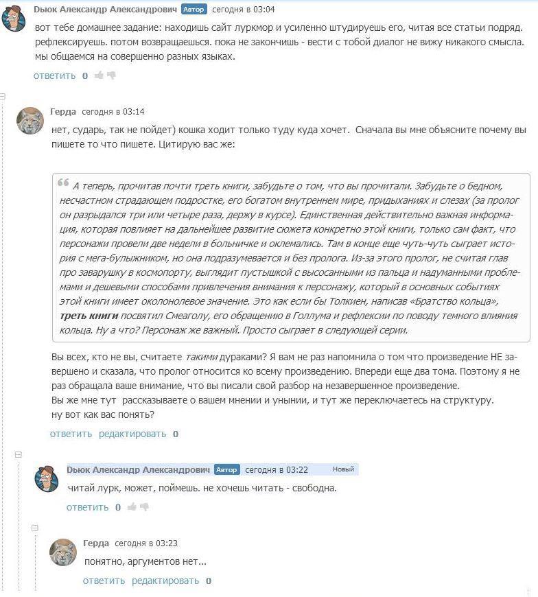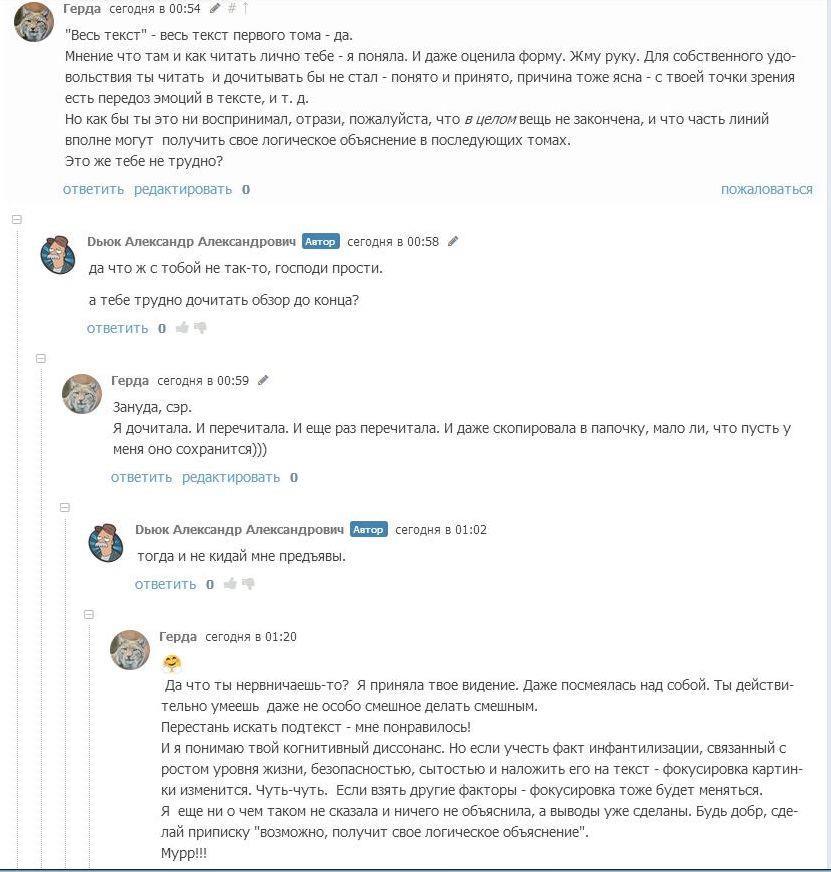 Но так это не работает. Кошка, конечно, та еще кошка, кто ж спорит - мерзкая киса, но кошка по жизни играет в разные игры на своих условиях. Такова жизнь, как только примешь чужие - тебя и съели. Я расценивала и расцениваю данное столкновение как вид литературно - аналитической дуэли. Такую изысканную забаву, подобную охоте на крыс-мутантов или отбившихся от стаи волков. И это - мое право, господа. И заманивать в свои сети невинных доверчивых жертв тоже оставляю за собой право любыми способами. Как мне сказал товарищ Дьюк: "клюнула на возможность разбора - сама виновата". Бедолага не знал, что если клюнул на возможность разобрать данный роман - сам виноват. Мог бы и задуматься что не один использует подобную тактику. Он не знал ничего о кошке? Ну так мог же спросить, весь АТ знает о моей любви к спорам. Не выяснил - ну кто же ему в этом виноват?