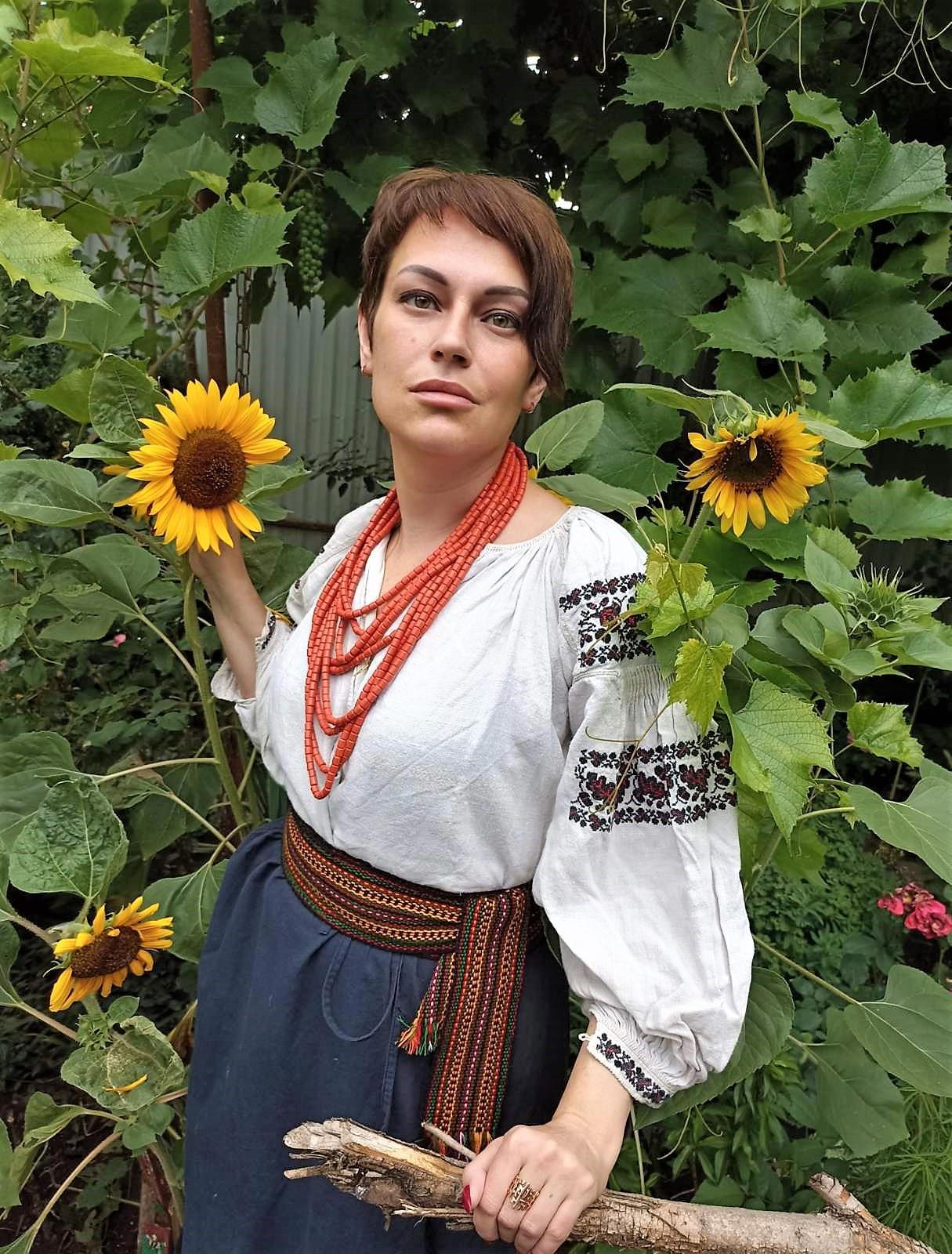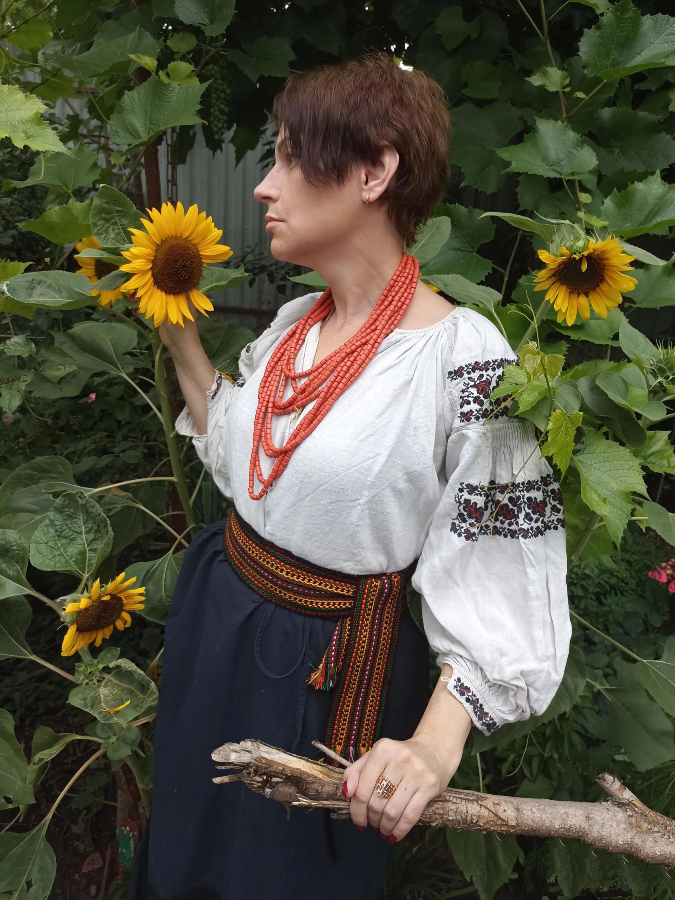 Да, фоточка с подсолнухами. В аутентичном старинном костюме за дохулион денег. Я впервые надела домотканую рубаху до пяток, толстенную как джинсы, ей лет сто наверное, как и остальному прикиду, кроме китайских сандаликов, но их не видно.