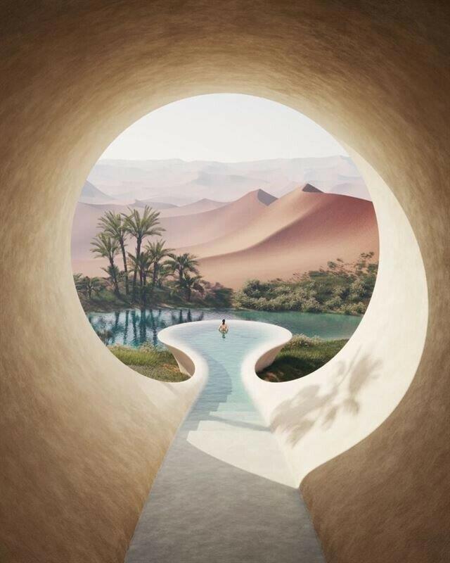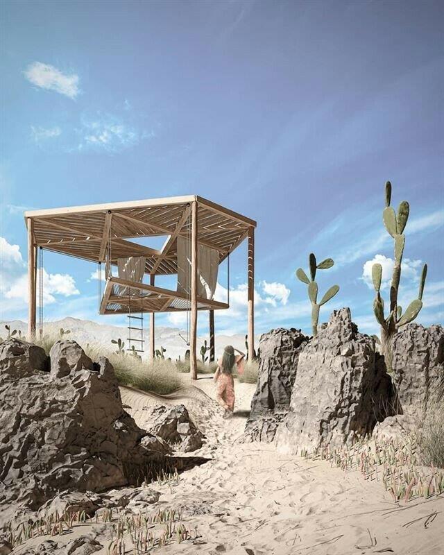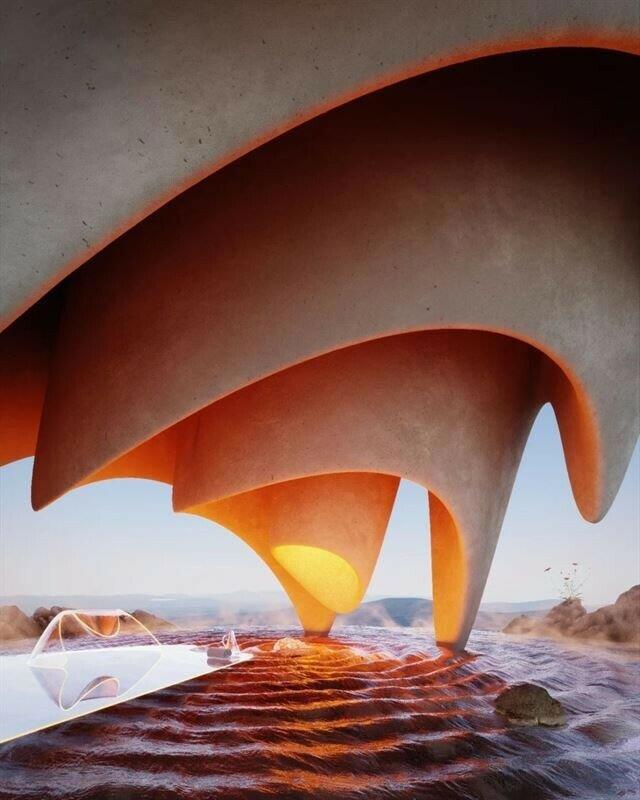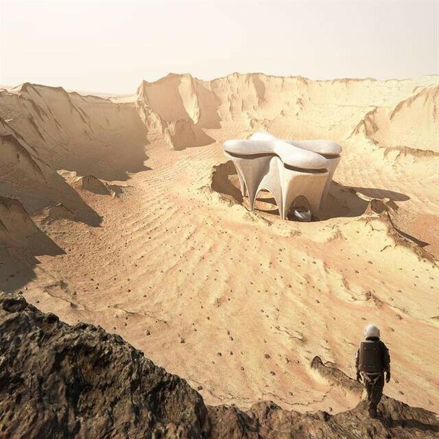 Окрашенный в тот же оттенок охры, что и скалы, в которых он установлен, он естественным образом вписывается в окружающую обстановку, несмотря на свой явно космический вид.