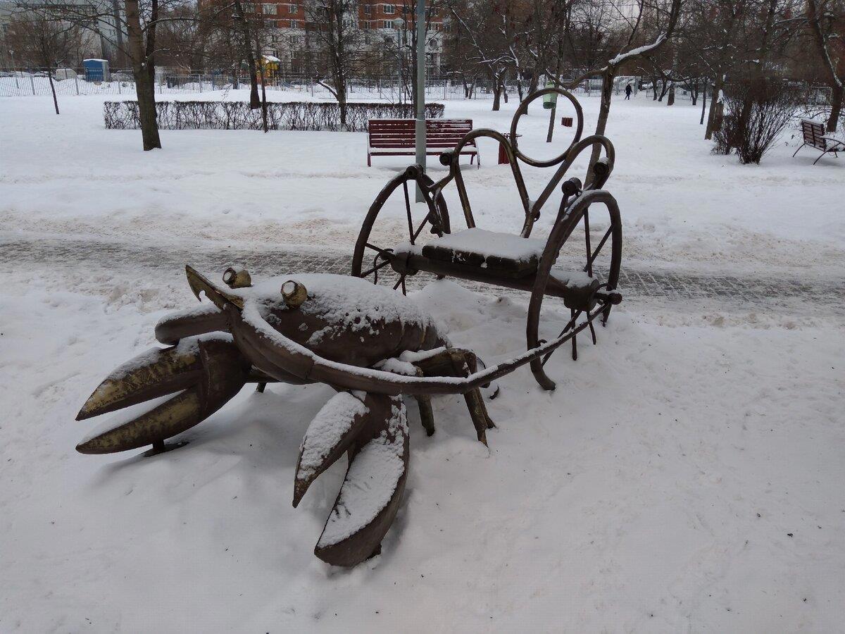 Рак запряжен в прогулочную коляску, в которую можно присесть и сфотографироваться