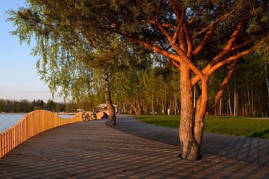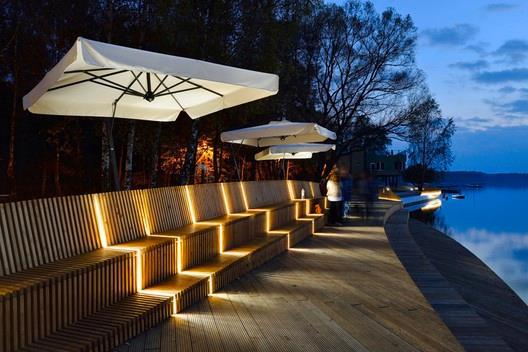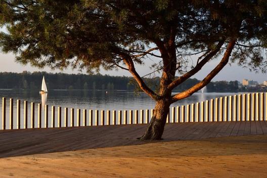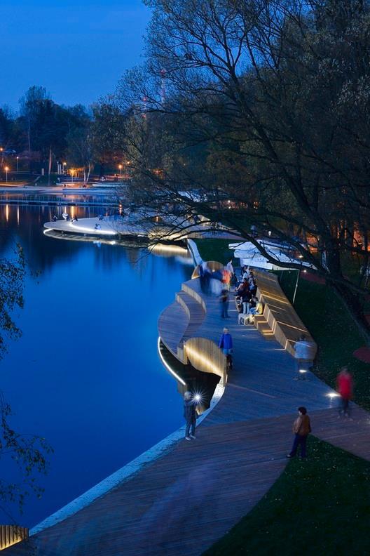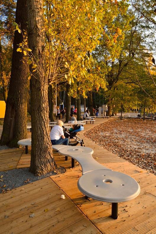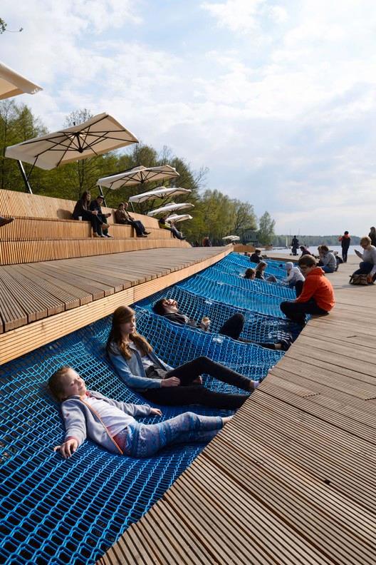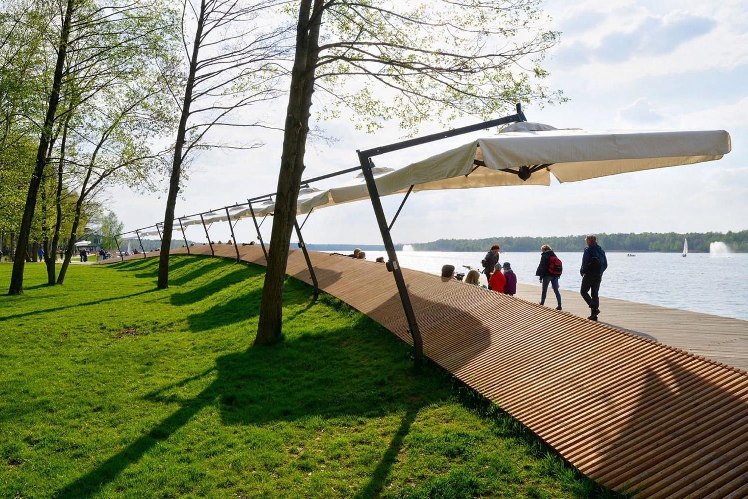 Целая набережная одета в дерево. Тут и скамейки - гамаки и шезлонги и зонтики и многое другое. Реконструкция берега озера Папрокани / RS + Роберт Скитек). Верхняя Силезия.