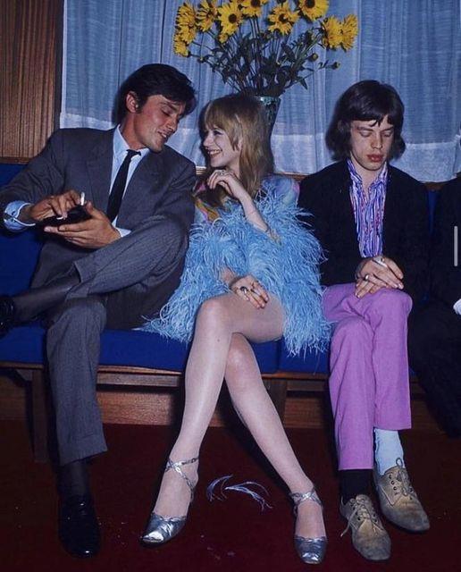 Мик Джаггер скучает, пока его девушка Марианна Фейтфулл болтает с Аленом Делоном, Париж, 1967 год.