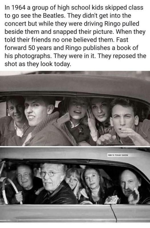В 1964-м группа школьников решила прогулять уроки, чтобы увидеть The Beatles. Они не попали на концерт, но Ринго Старр сделал это фото. Когда они рассказали друзьям, никто им не поверил. Через 50 лет Ринго выпустил книгу со своими фотографиями. И они были там! Друзья решили сделать такой же снимок снова.
