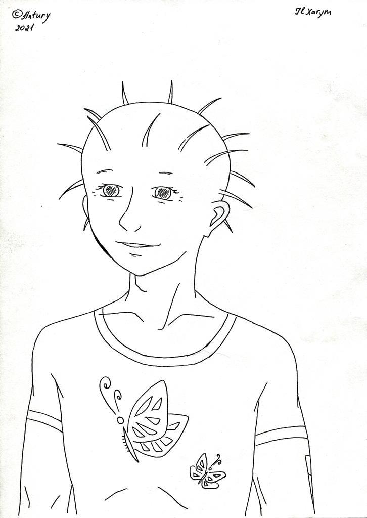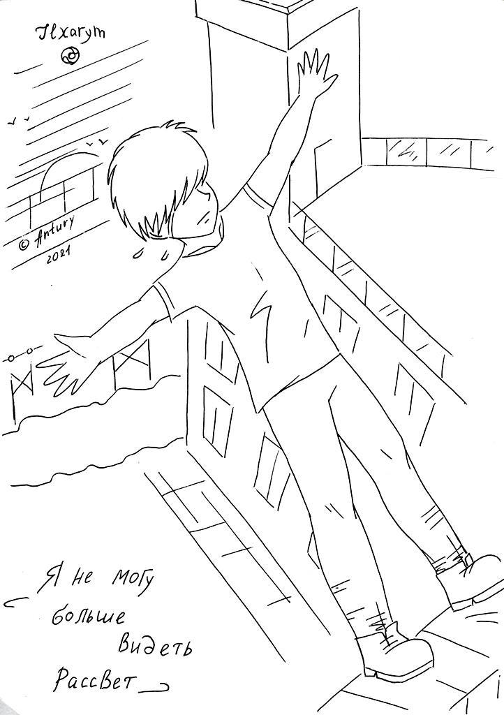 На рисунке – первый в истории элькса-феномена панта, покончивший с собой из-за неудовлетворённого инстинкта перехода в эльксарим, Бенджамин Беккер (роман «Эльксарим. Дети-киборги»):