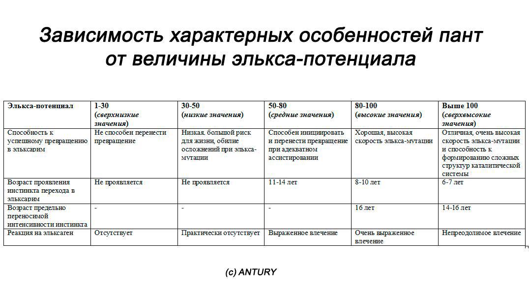 Как видно из таблицы, при элькса-потенциалах ниже 50 единиц панта не имеет вообще никакой нужды в элькса-мутации. Мало того, если инициировать у него этот процесс, он будет сопряжён с осложнениями и высоким риском для жизни.