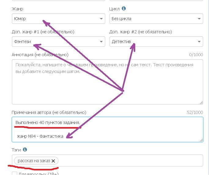 При этом, в вашем рассказе должны использоваться, как минимум 40 из 50 заданных пунктов, о чём также необходимо сообщить в примечаниях автора (см. рисунок выше).