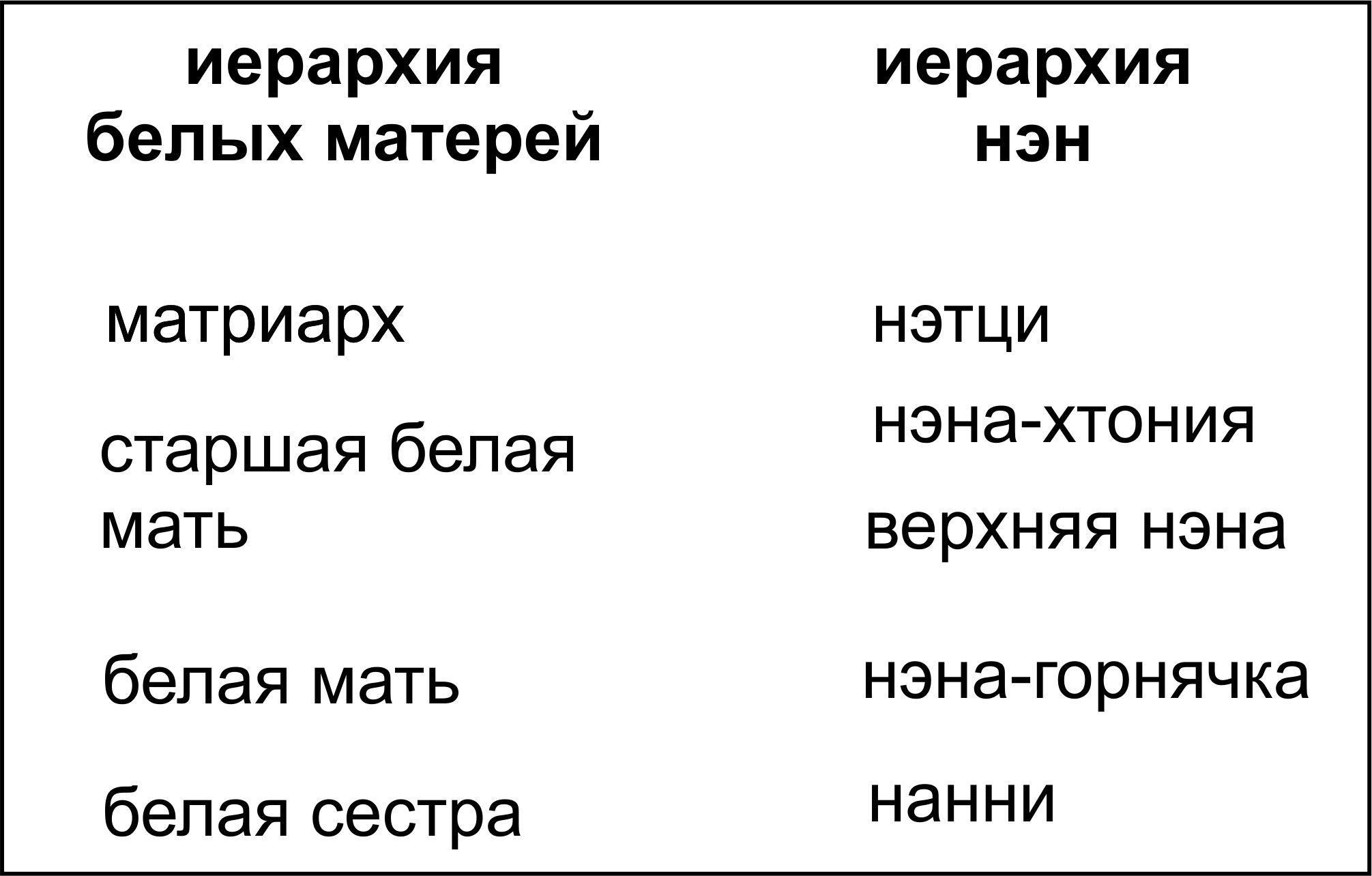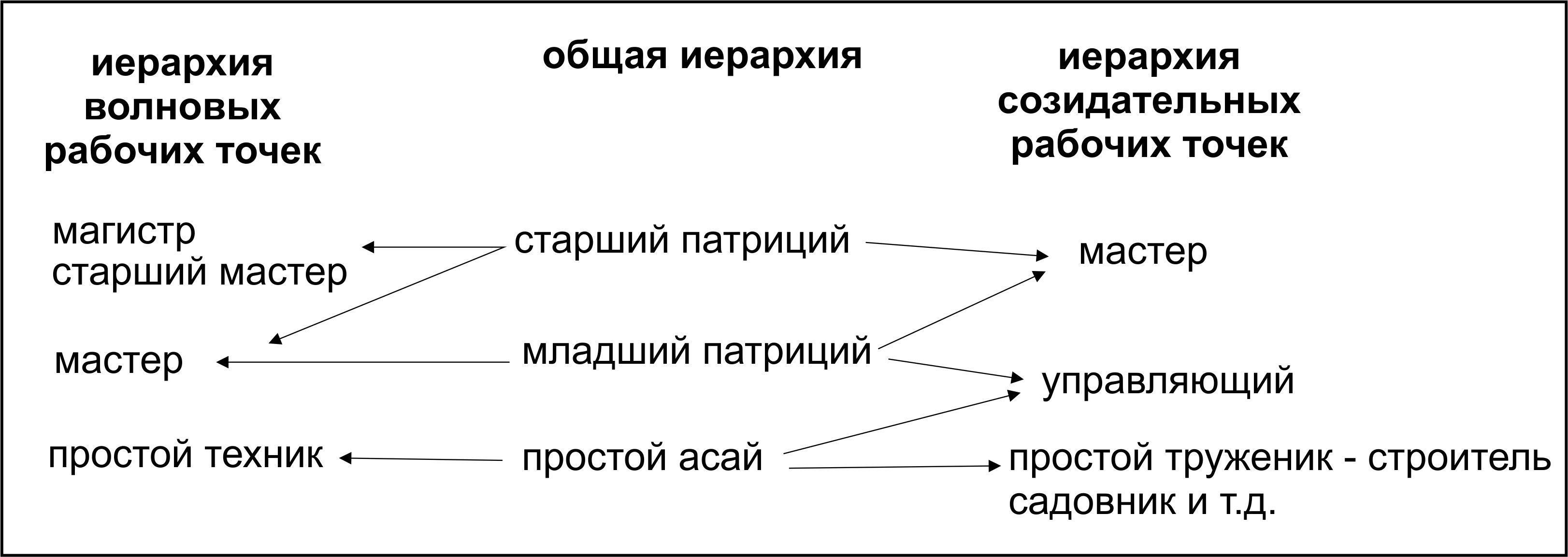 Гиеджи: Тут все просто! Ты уже видишь на схеме, кто над кем располагается. Я лишь добавлю, что низшая ступень - белые сёстры не тожественны простым асайям. Белые сёстры уже как минимум малдшие патриции. Белые сёстры обычно служат в обителях, где живут асайи, и заботятся о них: следят за здоровьем общины, как физическим, так и ментально, а так же занимаются воспитанием маленьких асайев. Одновременно с этим белые сёстры занимаются изучением секрета жизни. Белая сестра становится матерью, когда изучает этот секрет и становится способна творить.