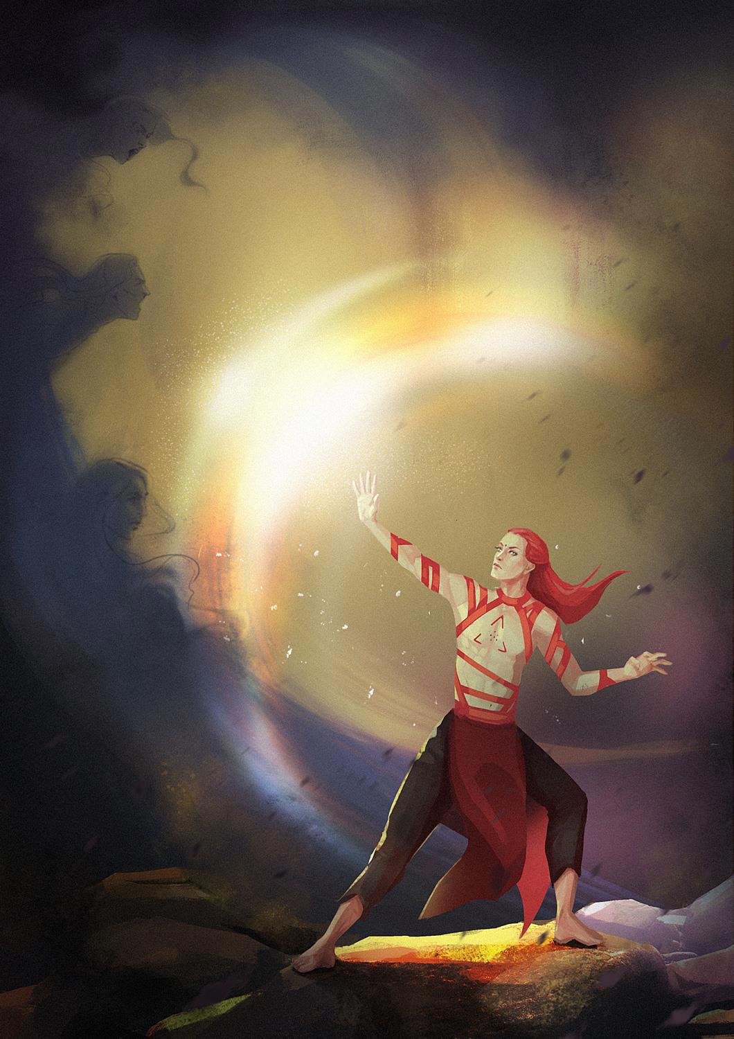 *Праматерь уносится в небеса в поисках заветного изображения. А рядом с мастером Караганом, который весь покрылся холодной пылью от слов Праматушки, возникает на миг огненный силуэт Древнего Инута*