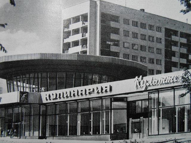 Улица Невская 16А, Торговый Центр (включающий одноимённый ресторан в "шайбе") "Белый Аист", построен в семидесятых годах двадцатого века. Фото 1977 года: