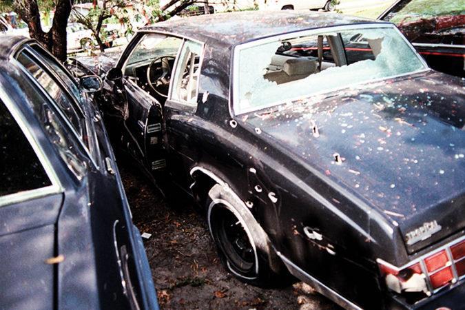 Платт за это время успел сделать 13 выстрелов, ранив трех агентов. Затем он посмотрел на подстреленного напарника и решил, что в машине стало как-то слишком горячо – не иначе, пристрелялись. В общем, он был прав – первую пулю он получил именно в тот момент, когда вылезал. 9-мм мощная (+Р) пуля попала ему в правую руку, затем в грудь, разорвала артерию и остановилась в дюйме от сердца. По мнению медицинских экспертов, это было смертельное ранение, но Платт плохо разбирался в медицине. Следующие две пули пришлись в ноги. Не смертельно, но ходить с такими ранами тоже не очень – если вы не Терминатор или не Майкл Платт. Ветеран Вьетнама разрядил по фэбээровцам револьвер, ни в кого ни попав, получил еще одну, уже четвертую, пулю в правое плечо и снова перешел на карабин. С Ruger Mini у него получалось лучше – одного агента ранило фрагментами пули, попавшей в руль. Другой получил пулю в шею и отключился, а Джерри Дова выбило пистолет.