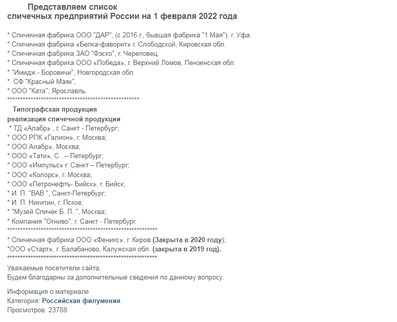 Неожиданно для себя выяснила, что балабановская (не знаю, как для других, а для меня самая известная!) фабрика оказывается закрыта ещё в 2019 году! Спросите, почему я вдруг, так внезапно, этим заинтересовалась? Дело в том, что в городке, в котором я живу, в марте были серьёзные проблемы со спичками: люди жаловались, что они вдруг пропали из продажи. Меня, "зажигалочницу", это мало волновало, да и проблемы с отсутствием в продаже спичек решились довольно быстро. Может быть, я бы ни о чём и не догадывалась, но сегодня меня угораздило потерять зажигалку. Не "Парабеллум", к счастью, который присутствует в одном из моих рассказов и действительно подарен мне незнакомым человеком на память из благодарности за помощь, - он перестал работать, а я никак не вырвусь съездить в областной центр, где есть хорошие мастерские, а самую обычную, дешёвенькую. Обнаружила я это в совсем маленьком посёлке (меньше двухсот жителей), куда завозила кое-какой груз, когда решила перекурить пока машину разгружали. Местные, разумеется, поделились спичками. Тогда я, увидев совершенно незнакомую этикетку, и глянула на производителя: