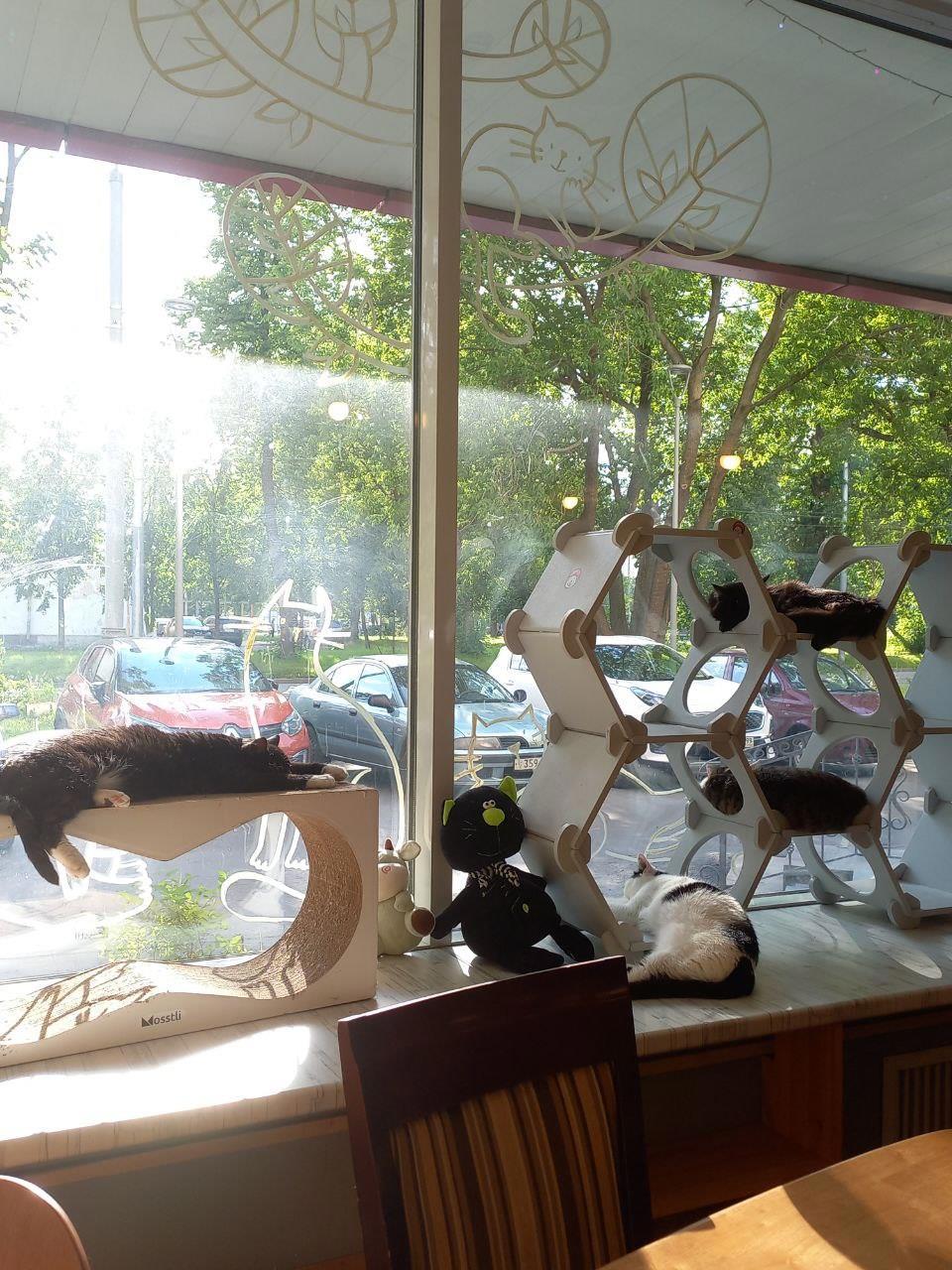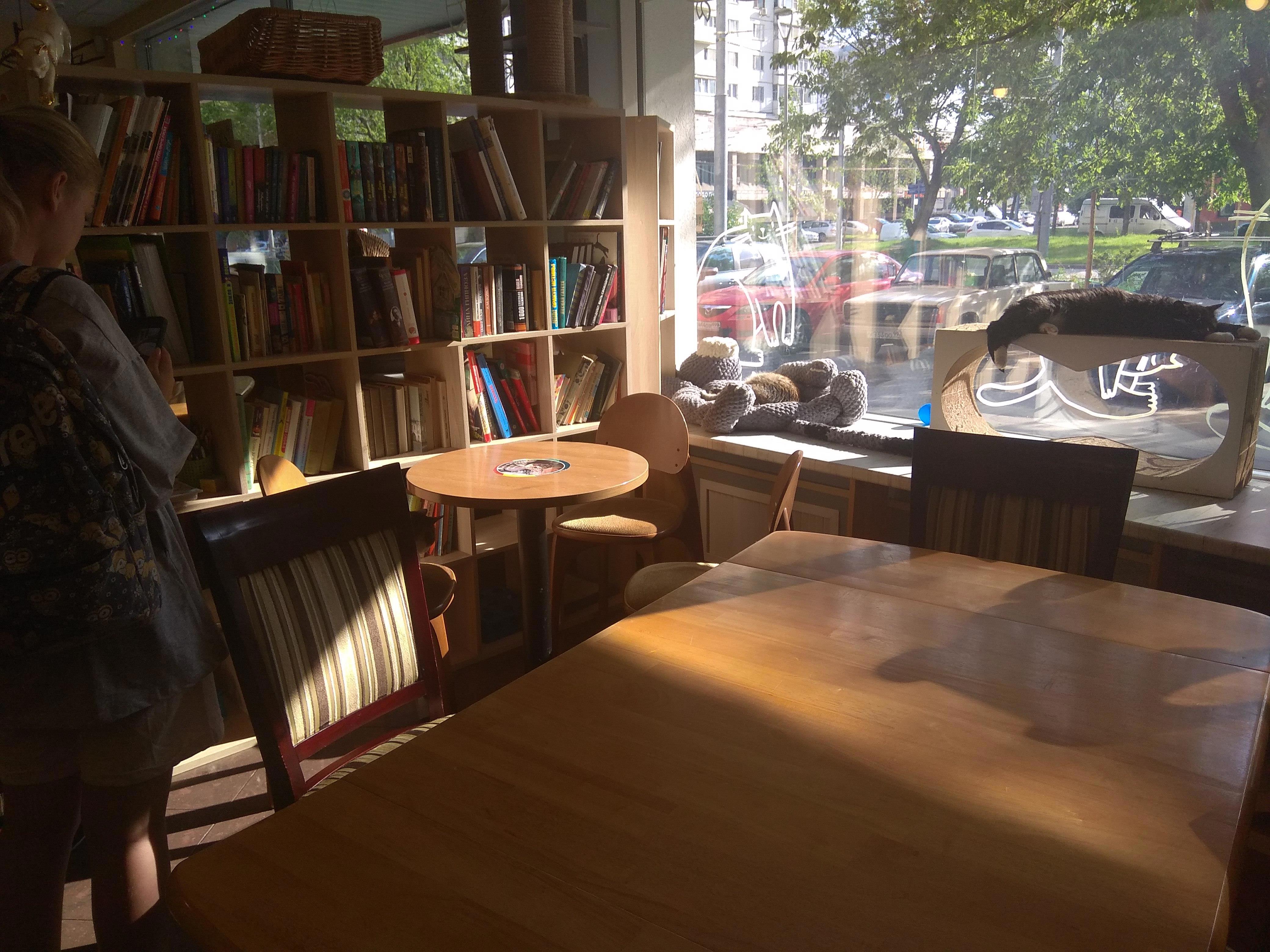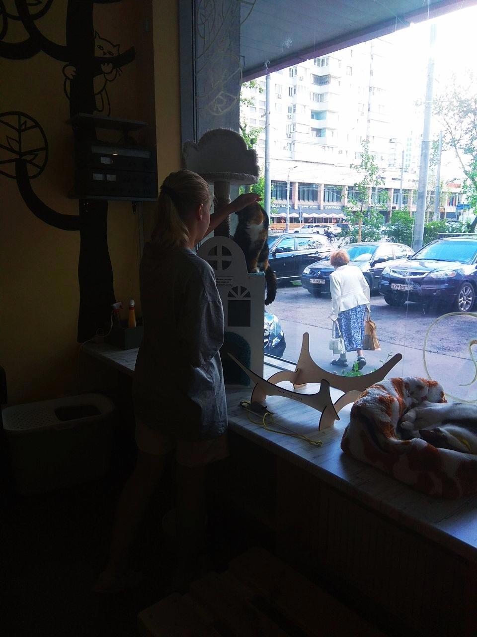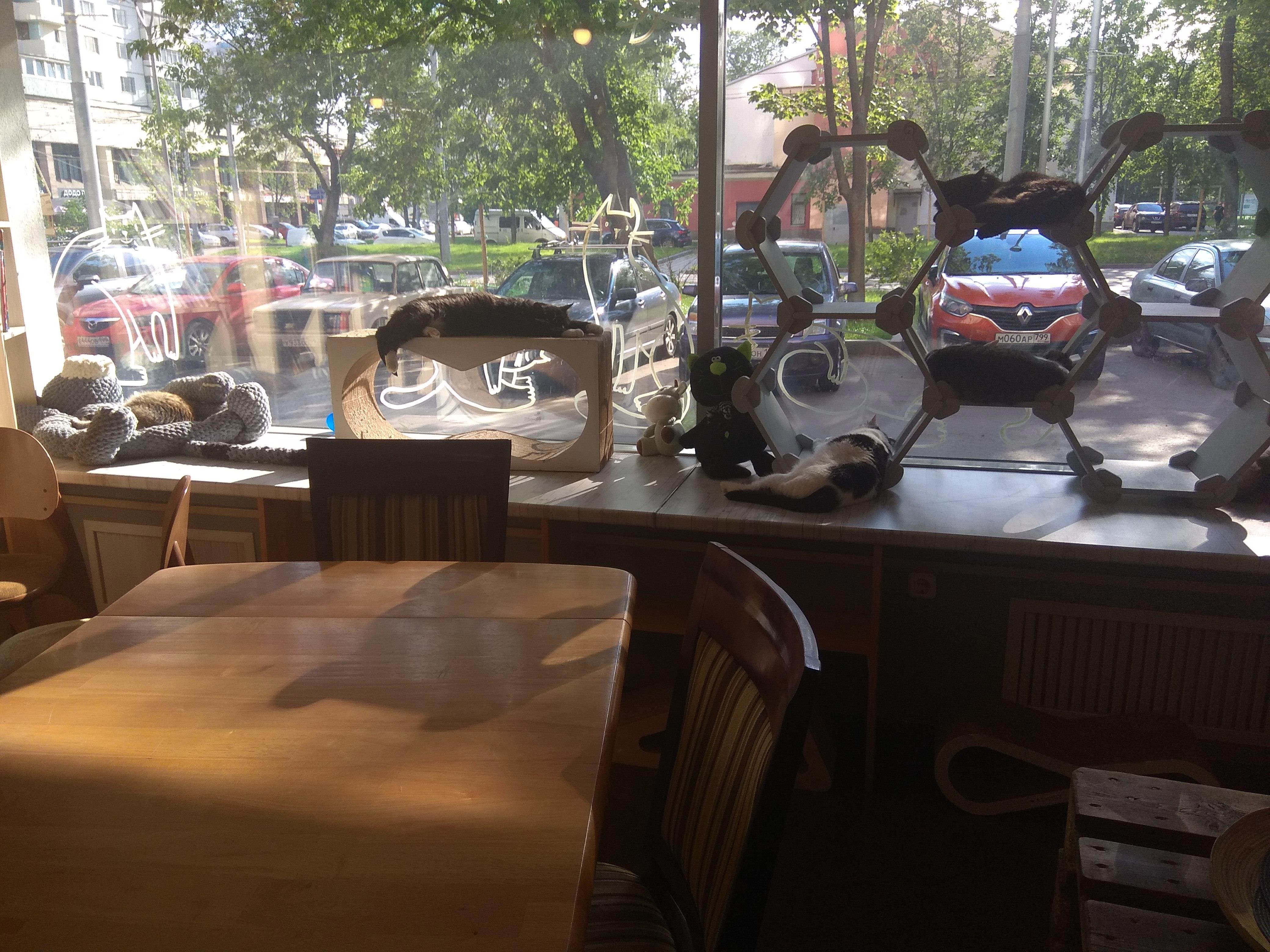 Когда-то давно я жила и работала в этом районе. Часто ходила мимо, но никогда не заходила в это кафе. Хотя и было любопытно, что это и с чем его едят. Думала, там все проще. На широких подоконниках дремали живые кошки, казалось, просто для антуража. А зашли -- мамочки!