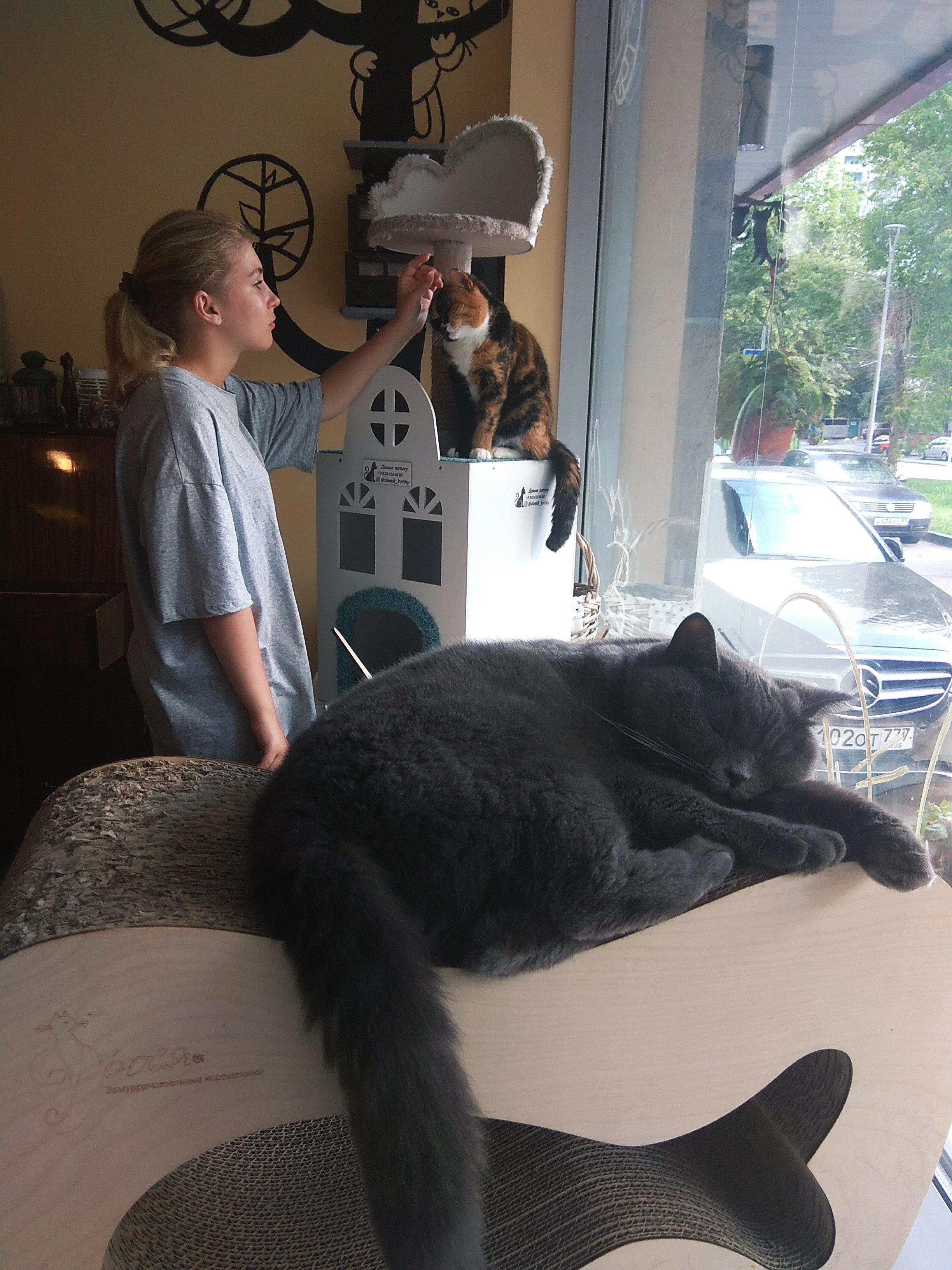 Естественно, постоянно мы бы в такое заведение не ходили. Хотя, как знать... Если учесть, что у нас нет возможности держать дома кота, потому что нас и самих-то дома не бывает, а носиться по Москве с животинкой не комильфо, то это, наверное, самый гуманный способ получить немножечко котоласки. Ну, если стать постоянным клиентом и посещать кафе с котиками хотя бы раз в неделю, можно добиться привыкания хоть одного животного.)) Слава богу, что у меня ребенок уже большой и ему этого не требуется. Есть другие вещи, которые заполняют нашу жизнь.