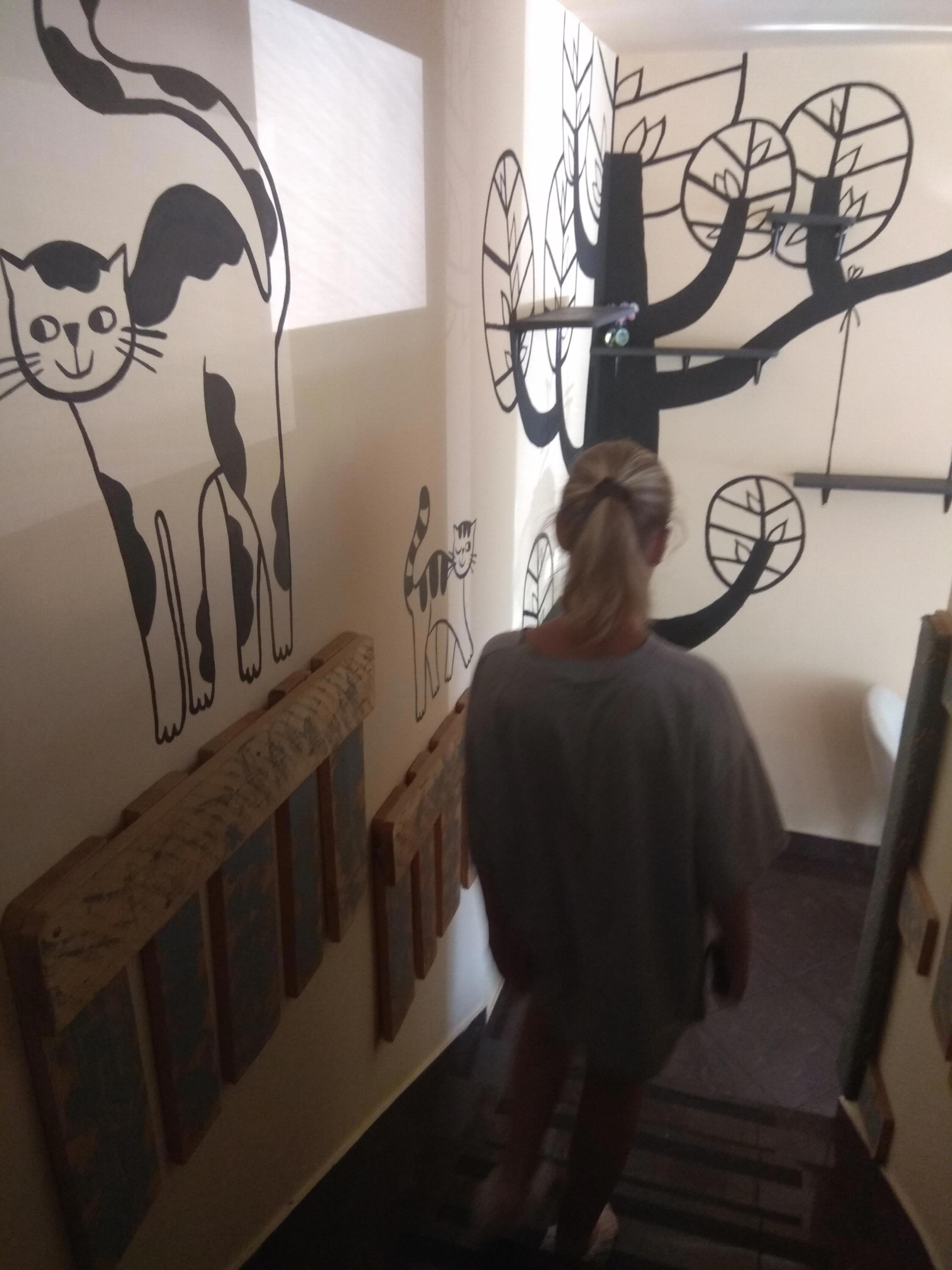 Нам предложили переобуться, предварительно надев одноразовые "носки", или пройти в одних "носках", похожих на бахилы. "У нас тут ходят без обуви, чтобы не придавить котятам лапки, -- пояснили нам. -- У нас много сейчас малышей". И мы пошлепали практически босиком. О, как прекрасно раззуться после многочасовой беготни по городу в жару и пройтись по прохладной плитке! Блаженство!