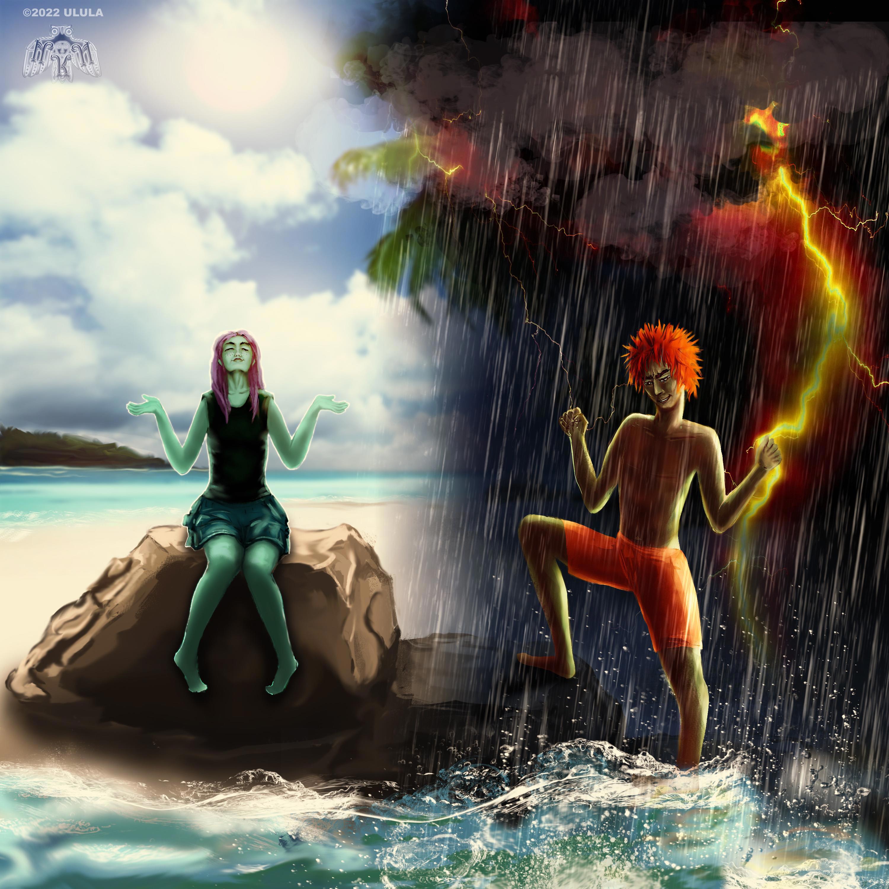 "Извини, увлёкся. У вас, конечно, немного другие органы восприятия и нет нужных имплантов. А у нас любой совершеннолетний так может. Есть два островка, над которыми официально разрешено управлять погодой. Подальше в океане, чтобы никому не мешать. Первый остров — там живет один заслуженный, очень уважаемый разумный. По своему складу он... Робинзон? А на другом острове дети тренируются".