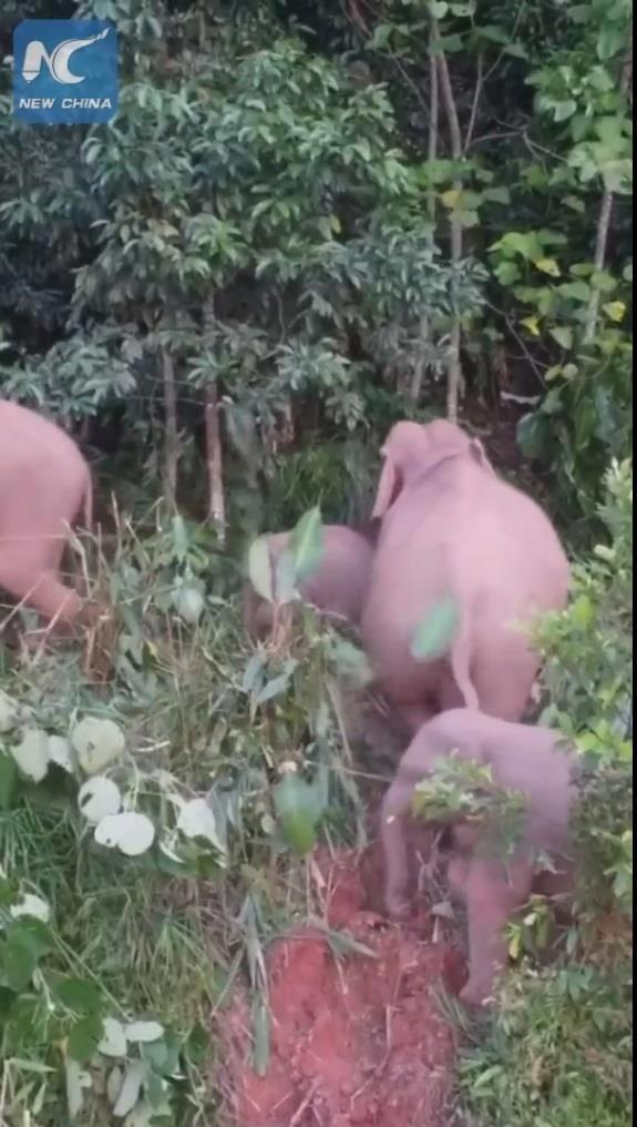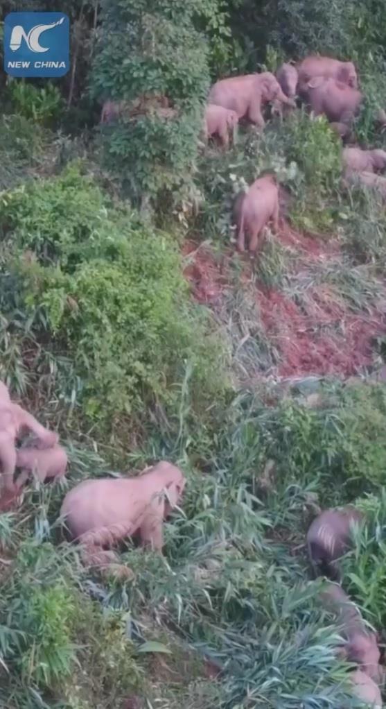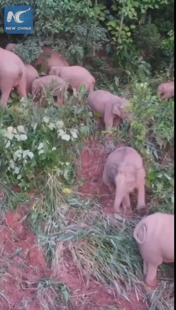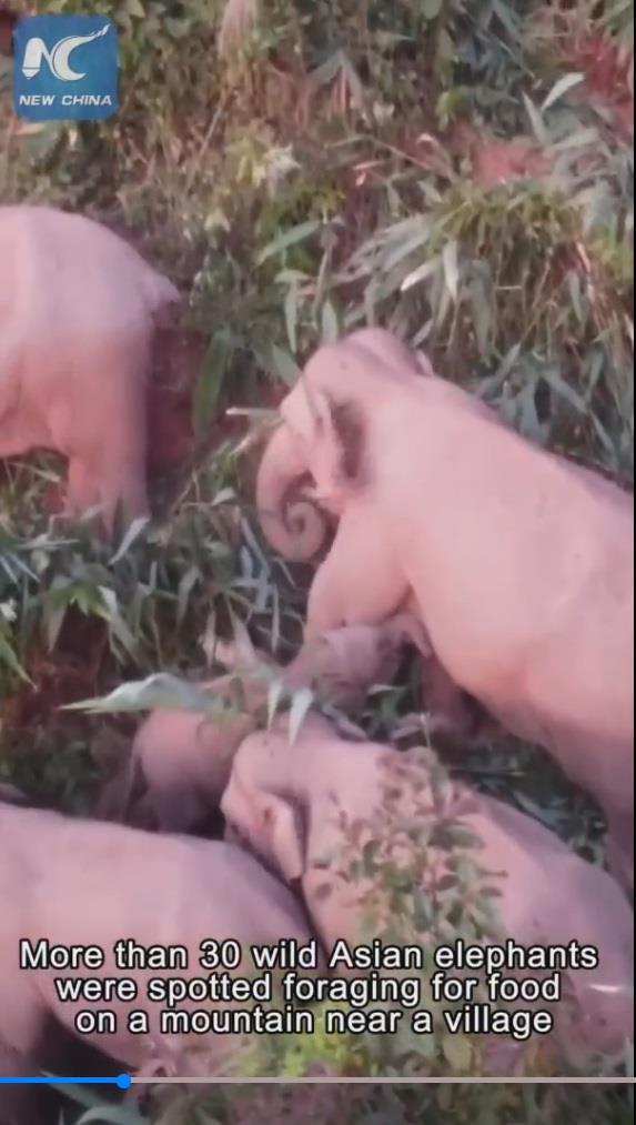 стадо диких и голодных азиатских слонов в количестве около 30 особей были замечены в поисках пищи на склоне недалеко от одной из деревень в провинции Юньнань на юго-западе Китая.